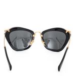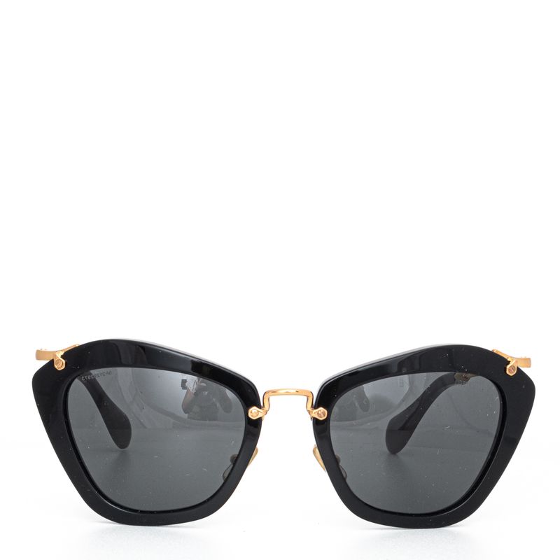 Óculos da marca Miu Miu, tamanho 15 cm C x 5,5 cm A, confeccionado em acetato preto com as hastes em metal dourado e acetato preto. O óculos encontra-se em excelente estado de conservação, com levíssimas marcas de uso.