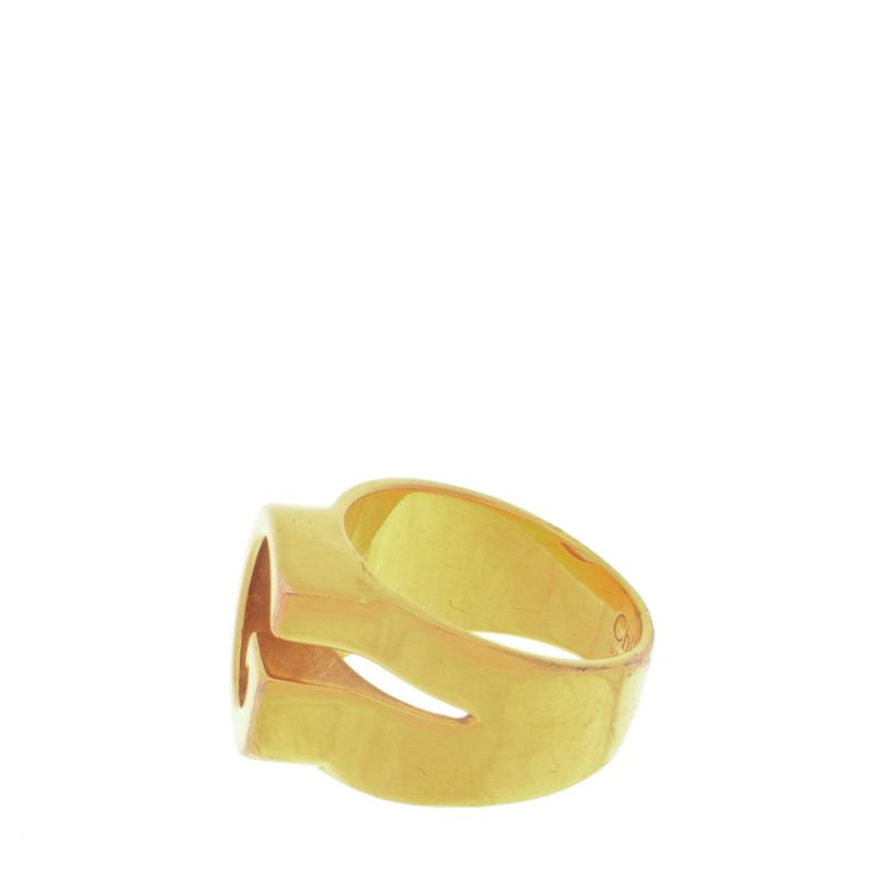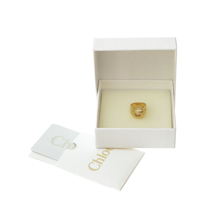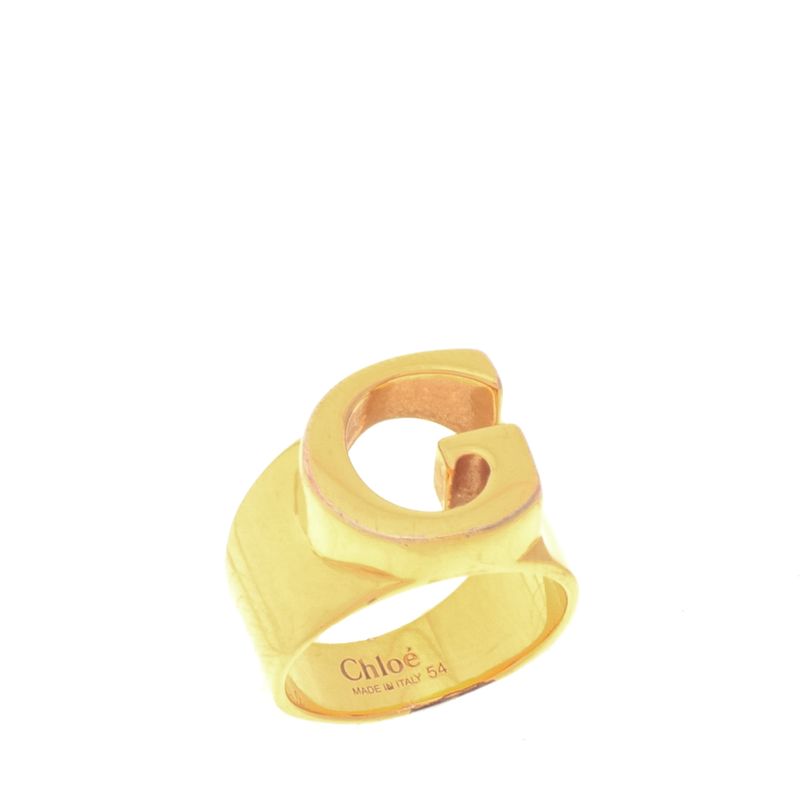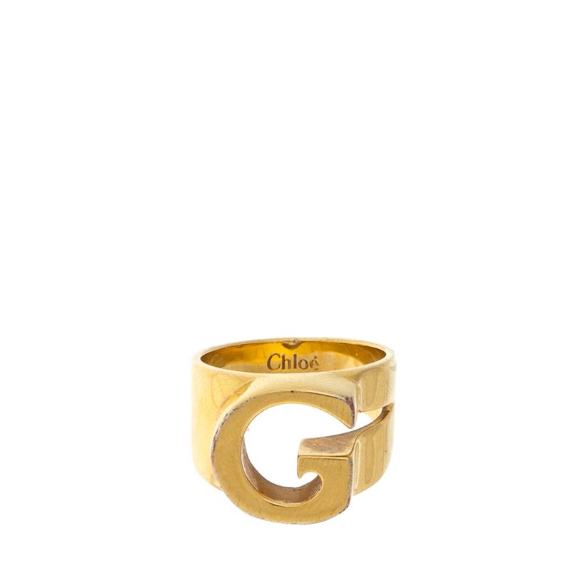Anel da marca Chloe, de letra G. Confeccionado em metal com banho dourado, possui aro 17 e não regulável. A peça se encontra em ótimo estado, com levíssima oxidação.