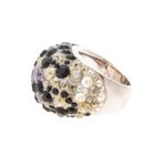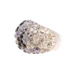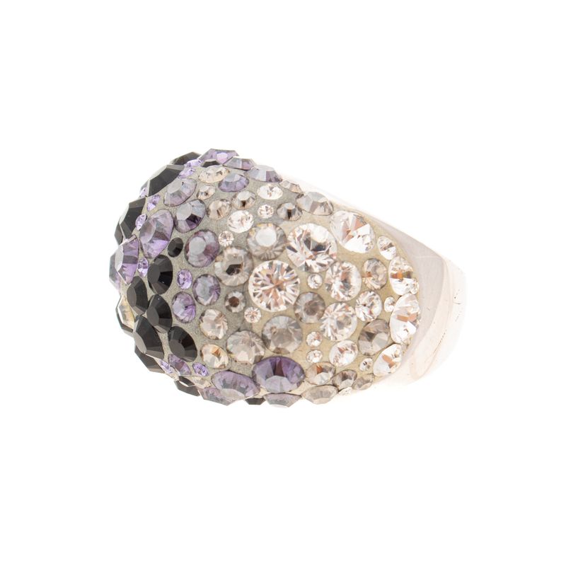 Anel da marca Swarovski. Confeccionado em metal prateado, com cristais pretos, roxos, transparentes e furta-cor. A peça se encontra em excelente estado, muito bem conservada.