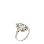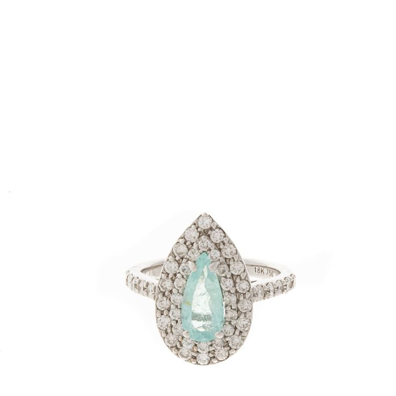 Anel Turmalina, confeccionado em ouro branco, com diamantes, uma pedra Turmalina Paraíba. Tamanho aro 19. A peça se encontra em excelente estado, muito bem conservada.