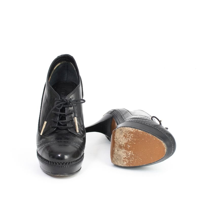 Bota de cano curto da marca Burberry, tamanho 37 sola, aproximadamente 35 Brasil. Confeccionada em couro preto, salto alto de altura 11cm e meia peta de 2cm. Fecho por meio de cadarço. Encontra-se em excelente estado de conservação.