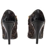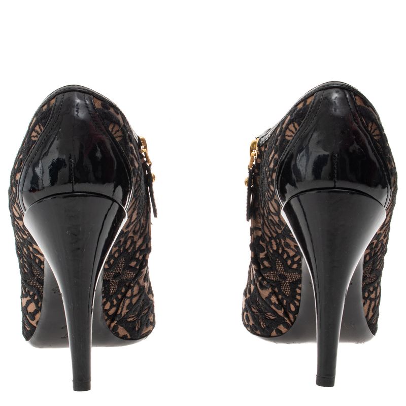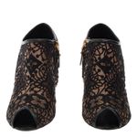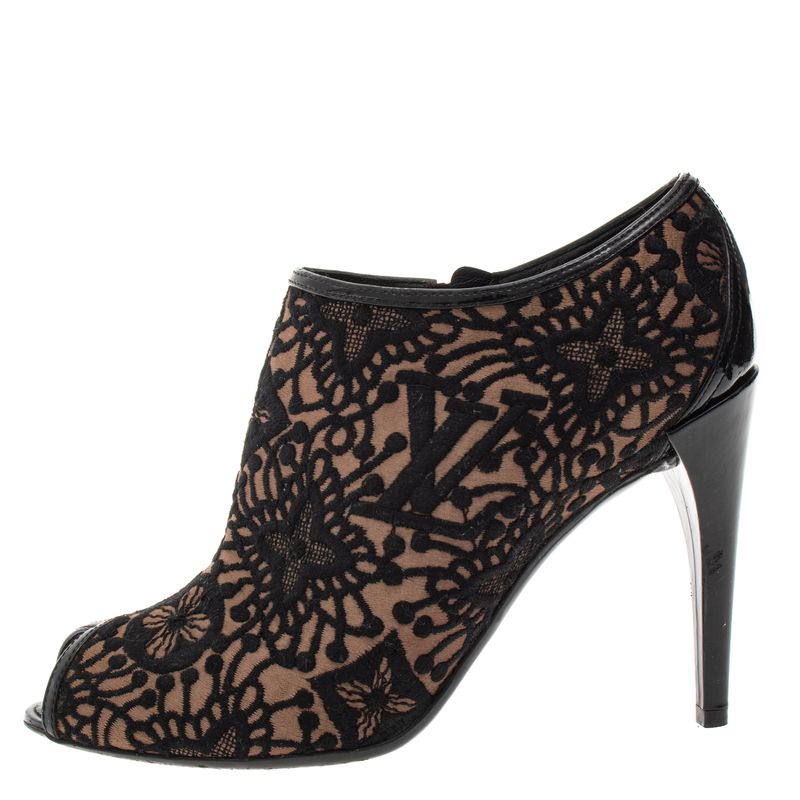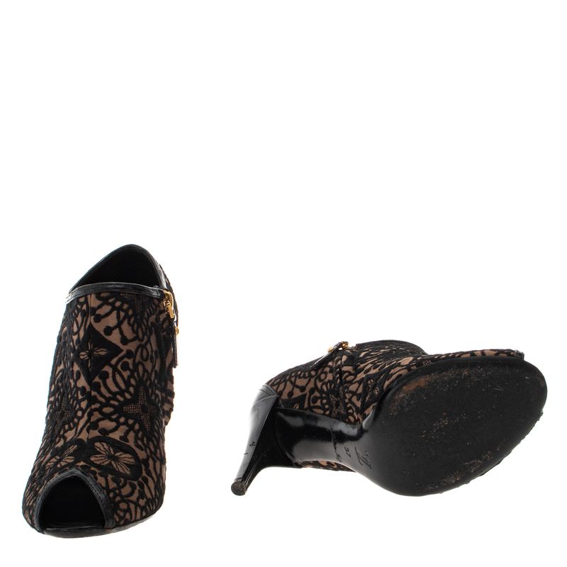 Ankle Boot Louis Vuitton, confeccionado em tecido bordado preto e bege, salto alto, fechamento por zíper. A peça se encontra em ótimo estado, com leves marcas de uso nas solas.