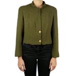 Blazer da marca Chanel, aproximadamente tamanho 38 BR, confeccionado em lã verde com botões em metal dourado com pedrinhas coloridas. Conta com mangas 3/4 e fecho por meio de botões. Encontra-se em excelente estado de conservação, sem sinais de uso.