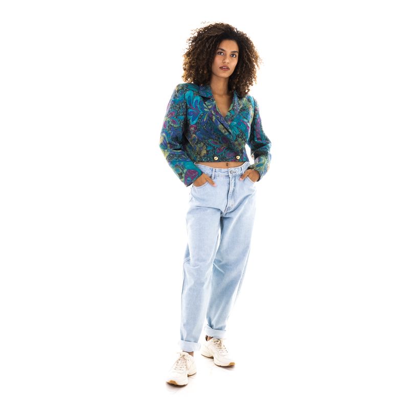 Blazer Cropped Vintage, tamanho G. Confeccionado em seda estampada, com ombreiras e dois botões dourado. A peça apresenta marcas de uso e desgastes.