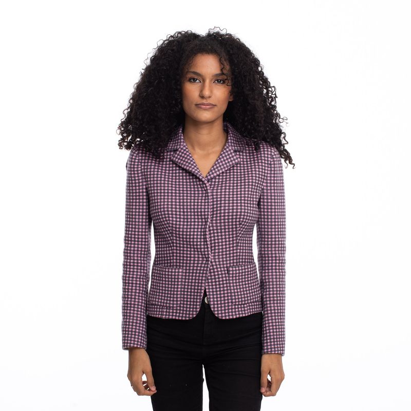 Blazer da marca Prada, tamanho 42 it. aproximadamente PP Brasil. Confeccionado em lã na cor rosa e preto. Encontra-se em ótimo estado conservação.