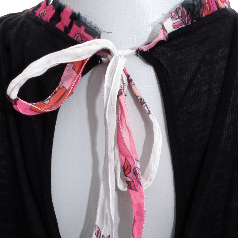 Blusa da marca Emilio Pucci. Confeccionada em algodão e cupro na cor preta, com detalhe de coração e babados na gola em seda estampada em tons de rosa, vermelho e preto. Modelo com decote nas costas e detalhe de amarração na nuca. O tecido possui leve transparência. A peça se encontra em excelente estado, muito bem conservada.