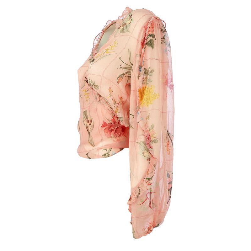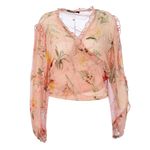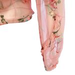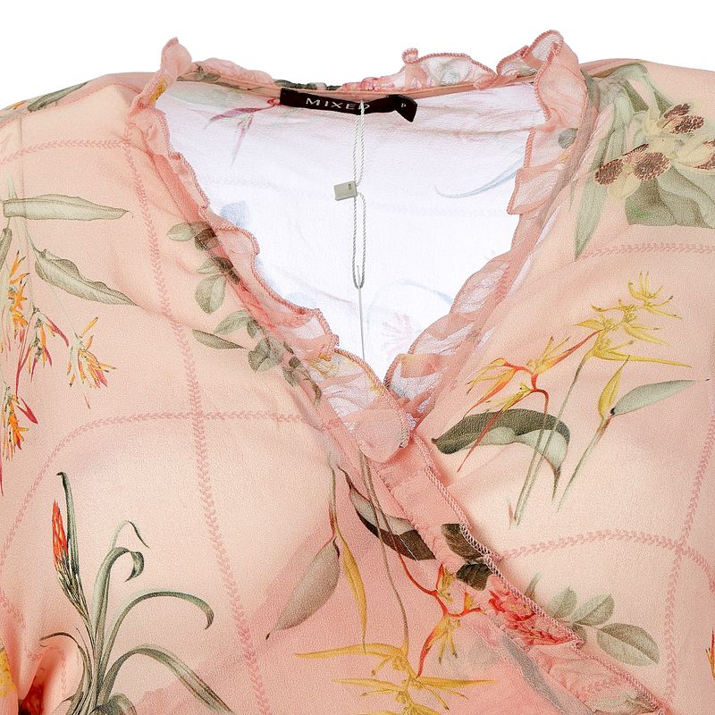 Blusa da marca Mixed. Confeccionada em seda rosa com estampa floral, transparência, mangas compridas e fecho por meio de amarração. A peça se encontra em excelente estado, muito bem conservada.