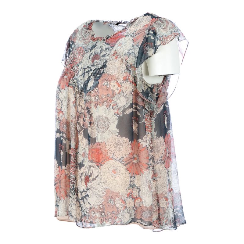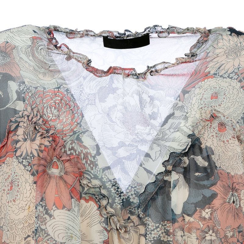 Blusa da marca NK. Confeccionada em tecido com estampa floral nas cores azul, coral e branca. A blusa possui babados na parte da frente, atrás, gola e mangas, transparência na parte de cima, um forro rosa na parte debaixo e fecho por botões no ombro em uma das laterais. A peça se encontra em ótimo estado, com levíssimas marcas de uso.