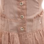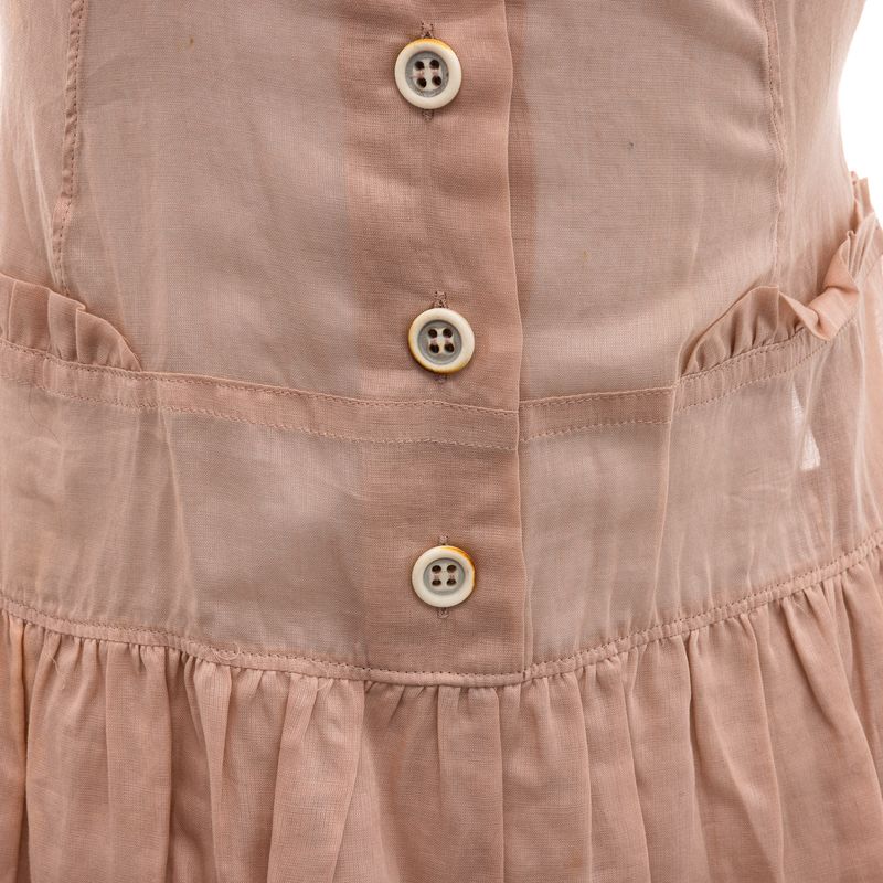 Blusa Prada. Confeccionada em tecido de algodão com transparência na cor rosa claro, conta com gola de renda branca, fecho por botões, fita para amarração na cintura e babados na parte inferior. A peça se encontra em ótimo estado, com leves fiozinhos puxados.