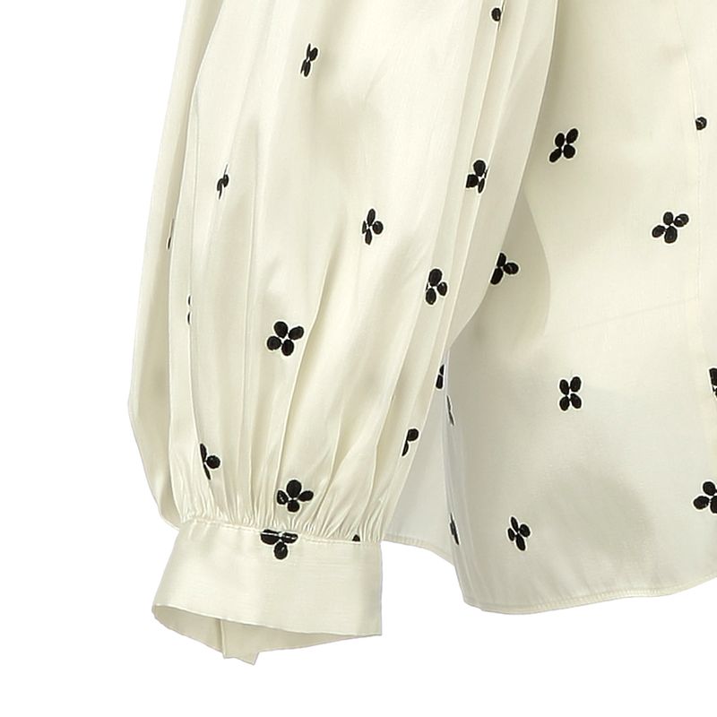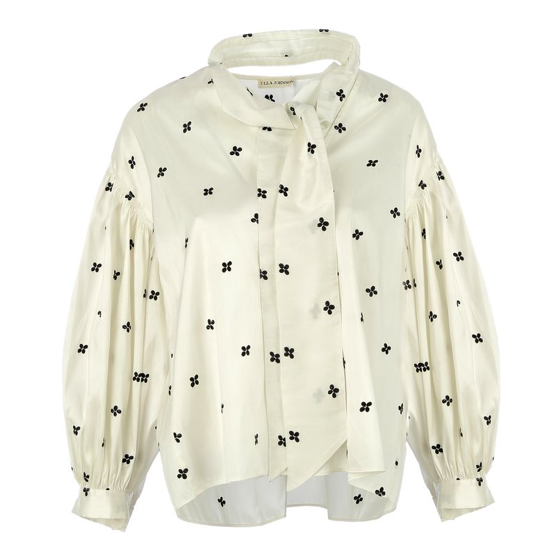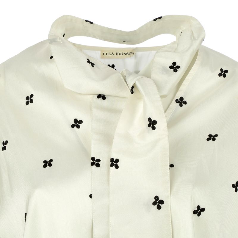 Blusa da marca Ulla Johnson. Confeccionada em seda e poliéster na cor branca. A blusa possui bordados em formato de flores na cor preta por toda a peça, mangas longas bufantes com fecho por botão de pressão no pulso, detalhe plissado nas mangas e costas, uma faixa removível na gola com amarração no pescoço e decote em V. Não possui fecho. A peça se encontra em ótimo estado, com levíssimas marcas de uso.