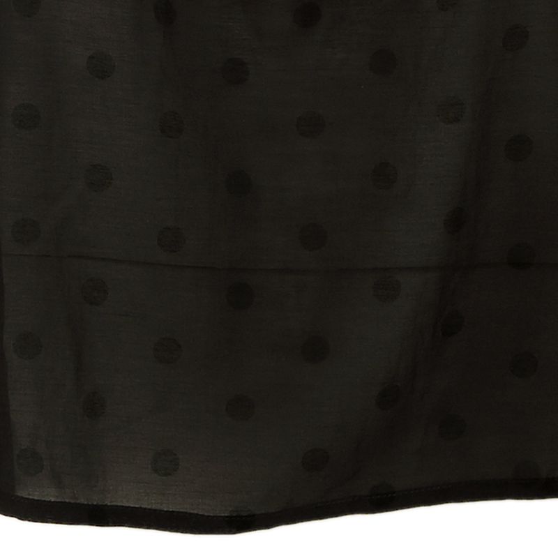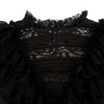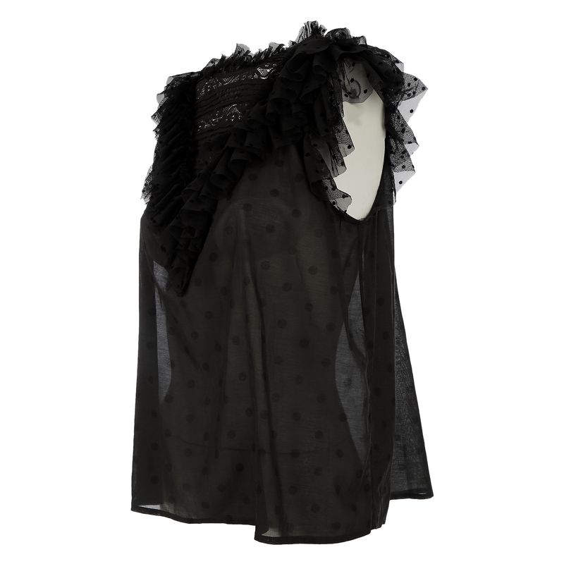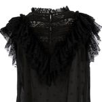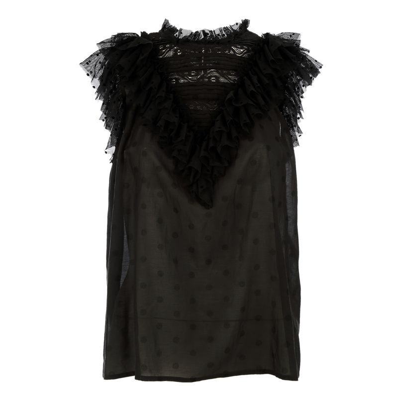 Blusa da marca Ulla Johson. Confeccionada em tecido preto, com babados, poá, renda e fecho na parte de trás por meio de botões. A peça se encontra em estado satisfatório, com apenas uma leve manchinha clara na parte da frente da blusa.