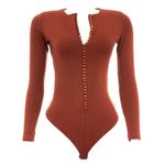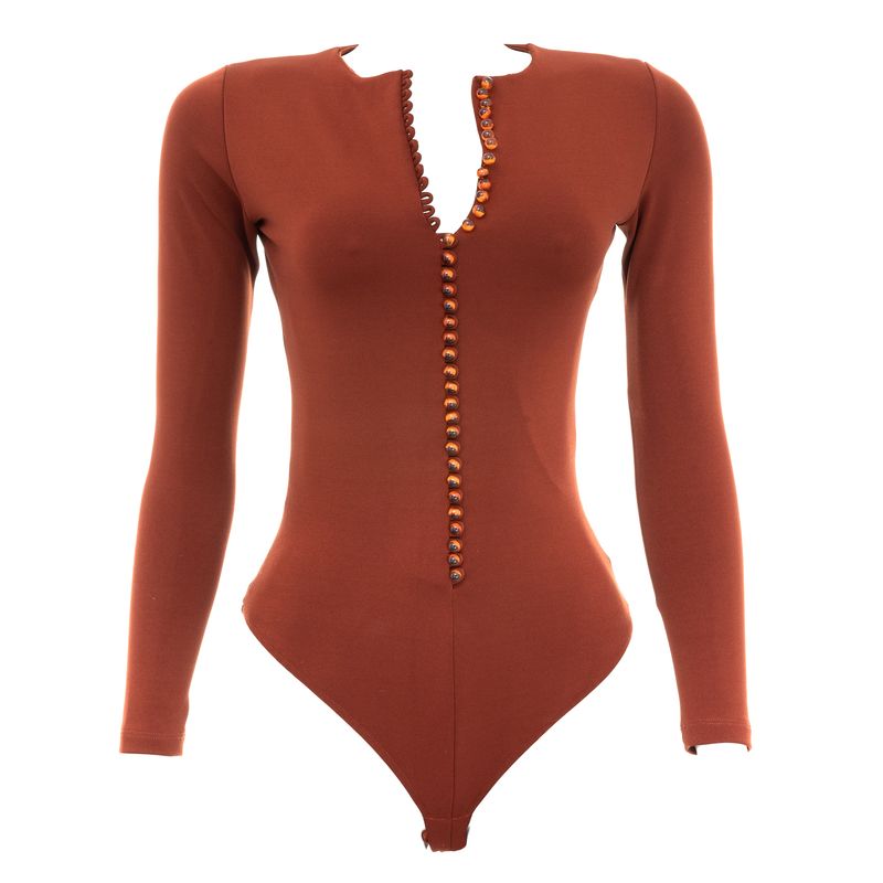 Body da marca Cris Barros. Confeccionada em poliamida, poliéster e elastano na cor terracota. Modelo manga longa, com botões esféricos em resina âmbar. A peça se encontra em excelente estado, muito bem conservada.