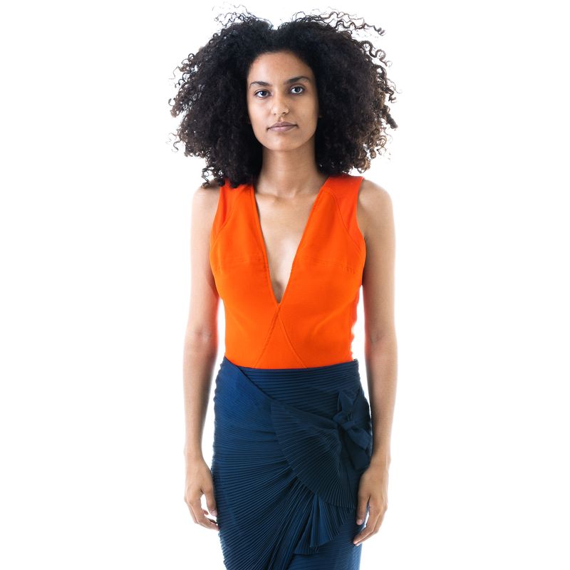 Body da marca Paula Raia. Confeccionado em tecido elástico e detalhes em tule ambos na cor laranja. Bodelo possui fecho de zíper nas costas e decote profundo no colo. A peça se encontra em excelente estado, muito bem conservada. Tamanho: P
