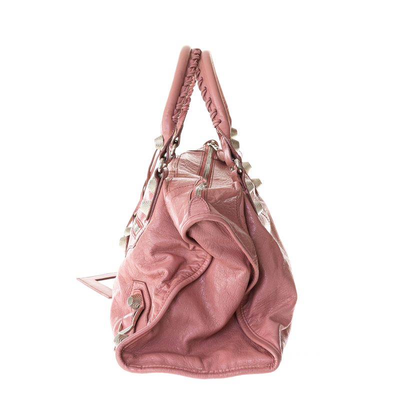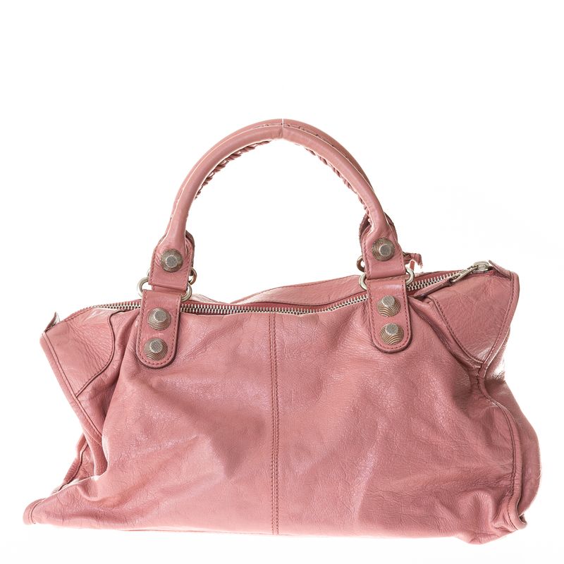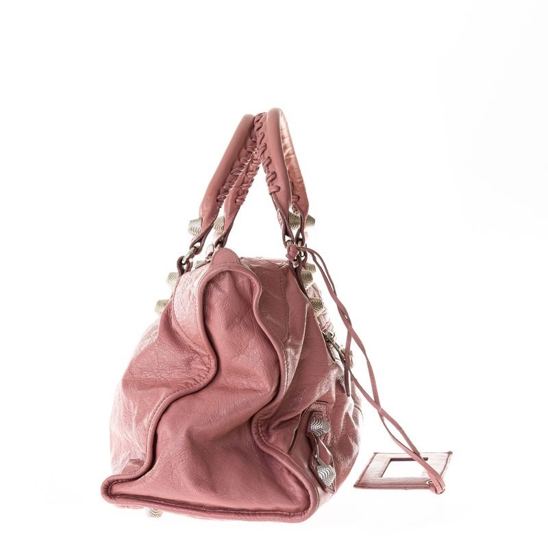 Bolsa da marca Balenciaga, tamanho: 44 cm largura x 28 cm altura x 16 cm profundidade. Confeccionado em couro na cor rosa, ferragens em metal prateado, aplicações de tachas. A bolsa contém duas alças de mão, um bolso externo, um bolso interno, acompanha espelho e fecho por meio de zíper. A peça se encontra em bom estado. Obs; a bolsa passou pelo processo de pitura.