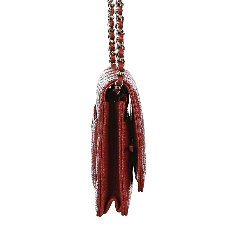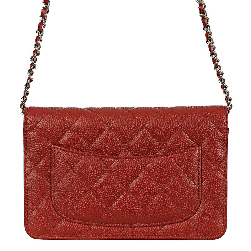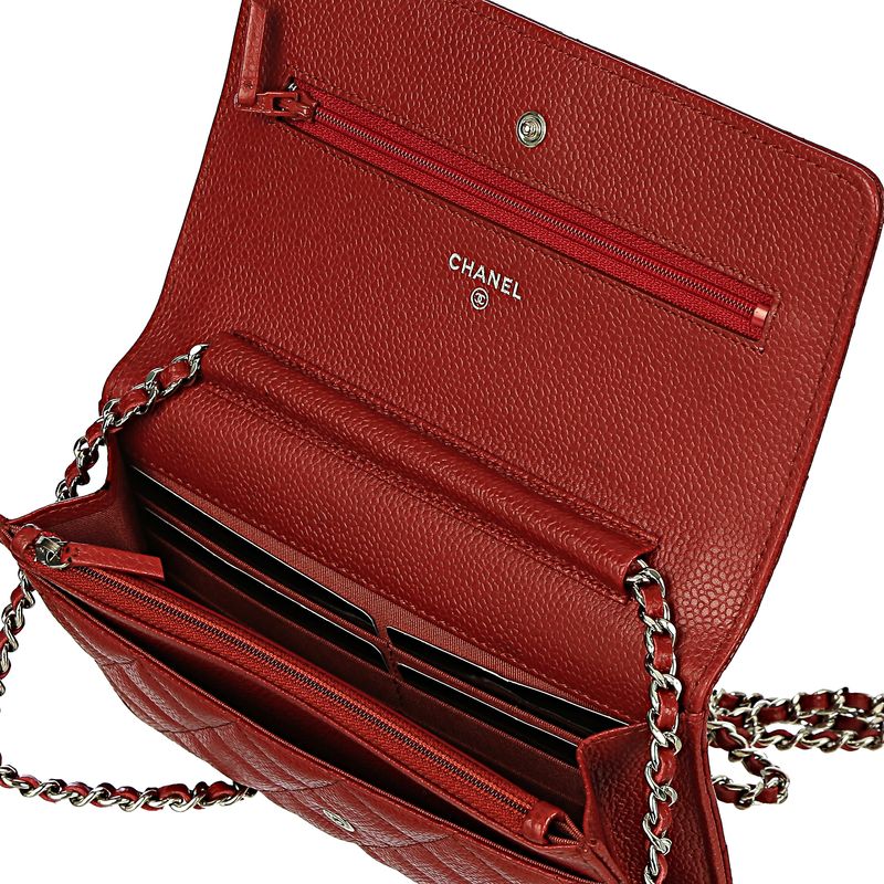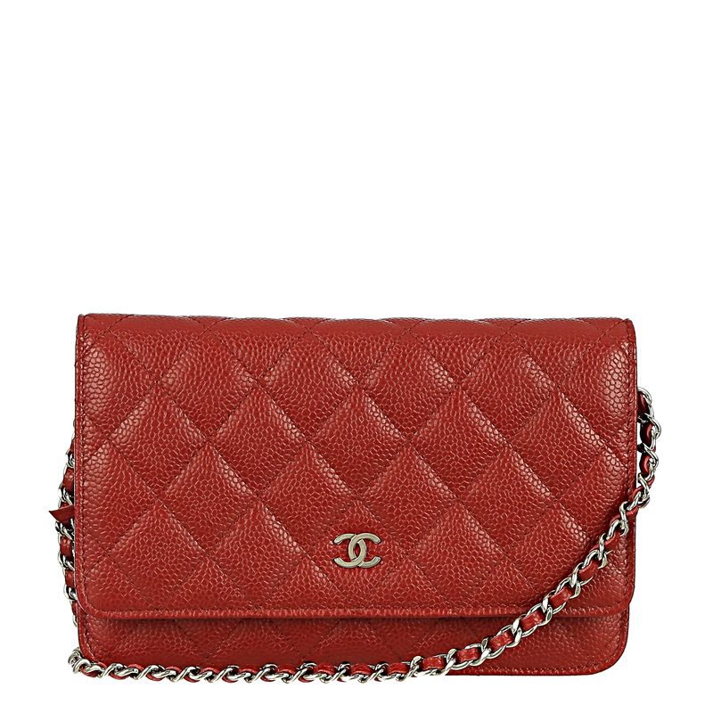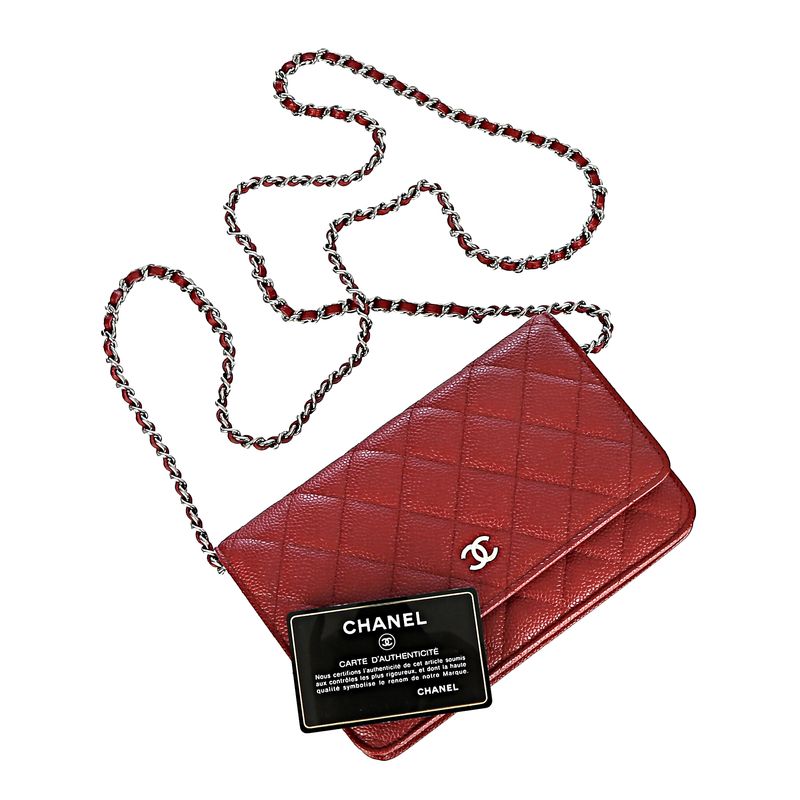 Bolsa da marca Chanel, modelo wallet on chain. Confeccionada no caviar da marca na cor vermelha com ferragens em prateado, contém uma alça longa em couro e corrente que pode ser usada transversal, um bolso externo, quatro bolsos internos e 6 porta cartões. O fecho é por meio de pressão com encaixe. Acompanha dustbag e cartão de autenticidade. A peça se encontra em excelente estado, muito bem conservada.