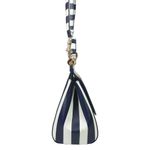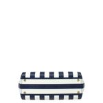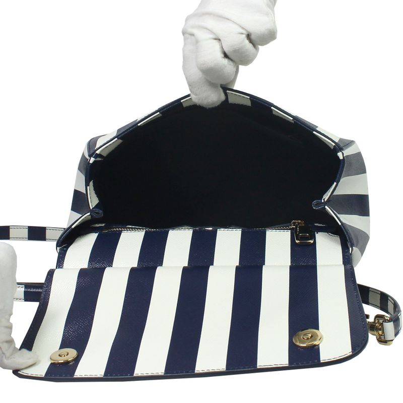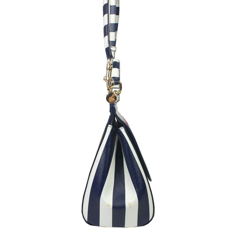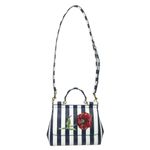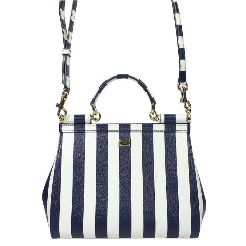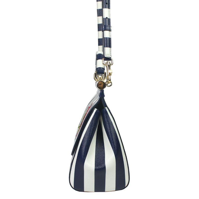 Bolsa da marca Dolce & Gabbana, tamanho 30 cm C x 20 cm A. Confeccionada em couro listrado branco e azul e ferragens em metal dourado. A bolsa conta com um detalhe com flor bordada na aba frontal, três bolsos internos e fecho por meio de botão magnético. Possui alça longa de transpassar removível e alça de mão. A bolsa encontra-se em excelente estado de conservação, sem marcas de uso.