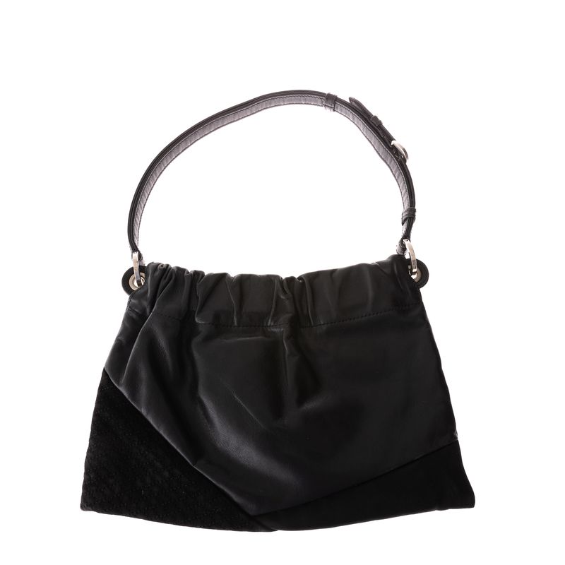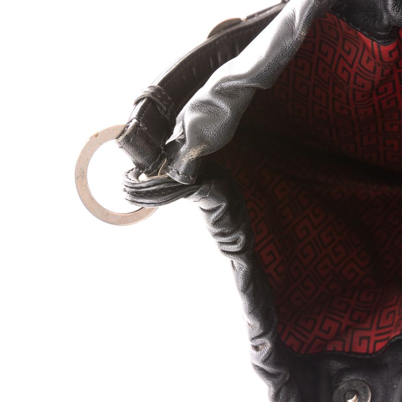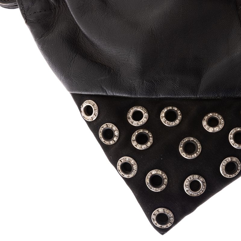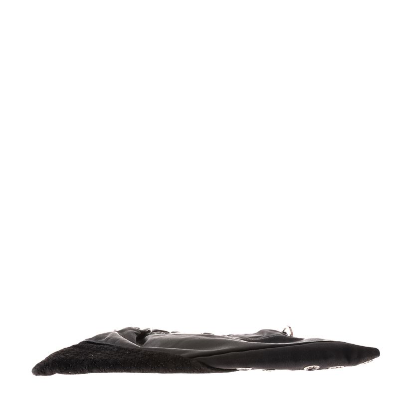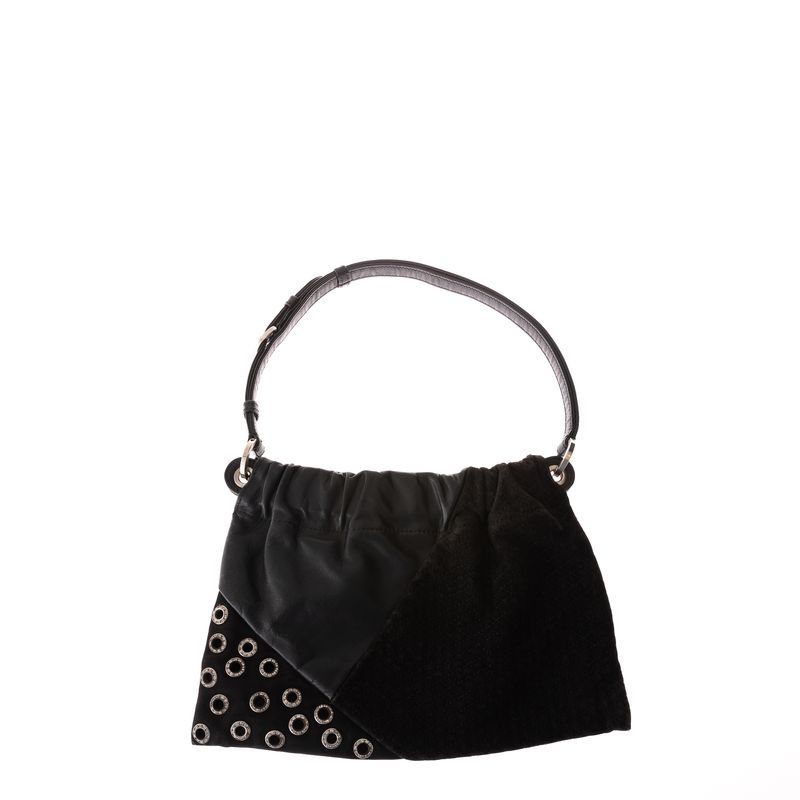 Bolsa da marca Giani Versace. Confeccionado em tecido e couro preto, com aplicações de ilhós com strass. Possui uma alça e fecho por botão magnético. A peça apresenta marcas de uso, desgastes e faltando alguns strass.