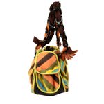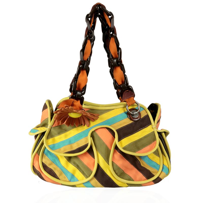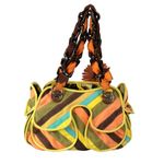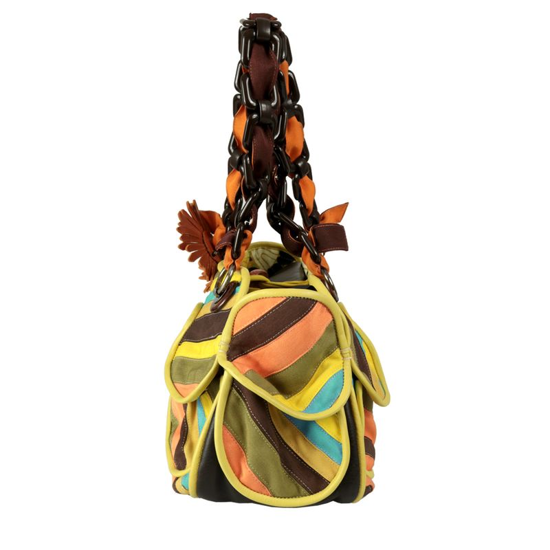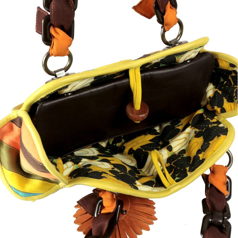 Bolsa da marca Jamin Puech, tamanho 33 cm C x 20 cm A, confeccionado em tecido estampado nas cores amarelo, laranja, azul e marrom, com detalhes em acetato, couro e madeira. A bolsa conta com duas alças de ombro, quatro bolsos externos, um bolso interno. Encontra-se excelente estado de conservação.