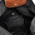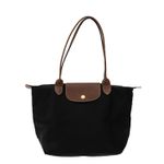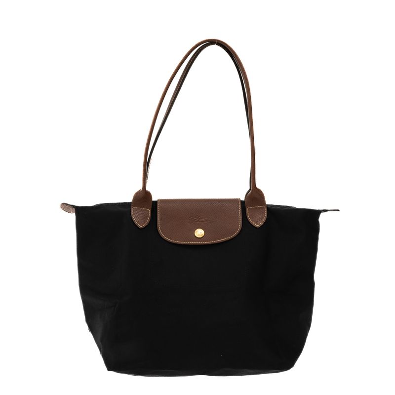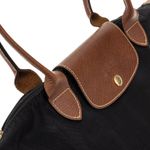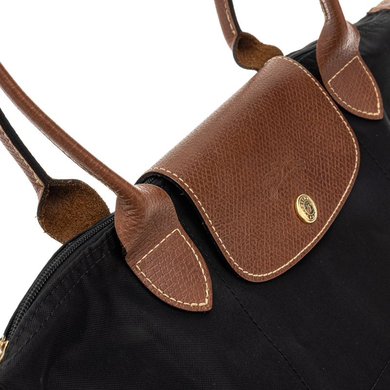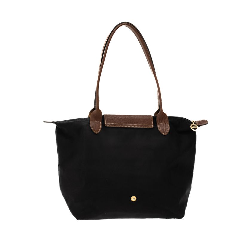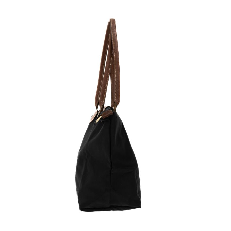 Bolsa da marca Longchamp Le Pliage. Confeccionado em lona preto com acabamento de couro marrom, ferragens douradas. A bolsa possui alça dupla de ombro arredondada, parte superior dobrável com fecho de encaixe, fechamento por zíper. A peça apresenta marcas de uso e desgastes mais significativos nas exterminadas.