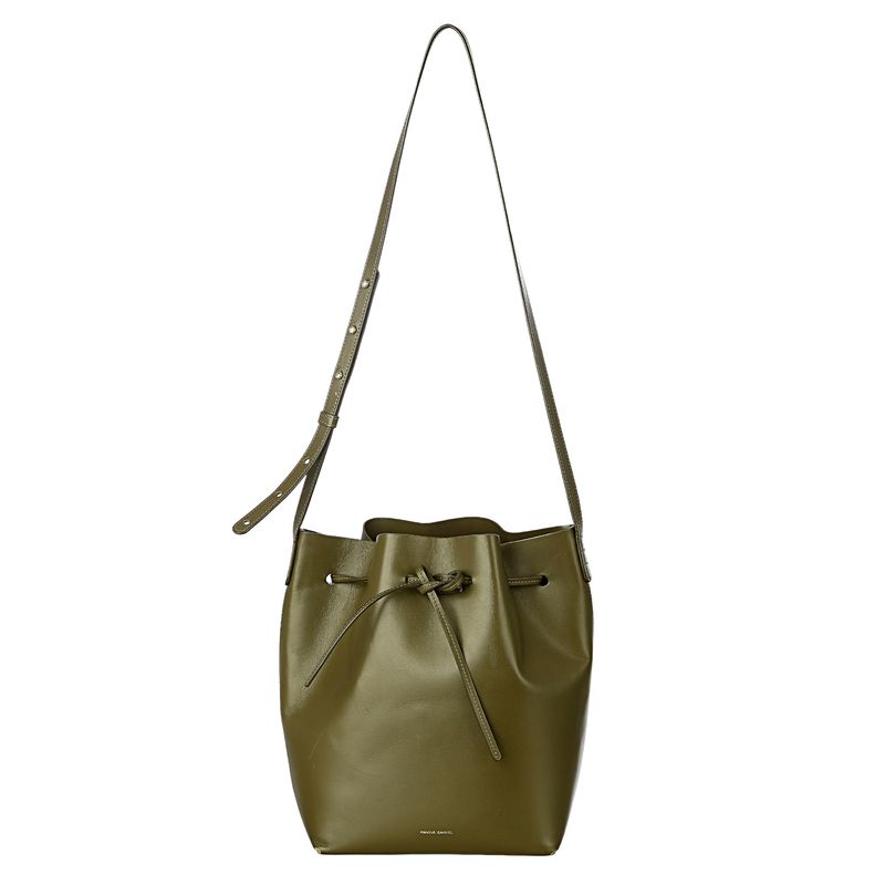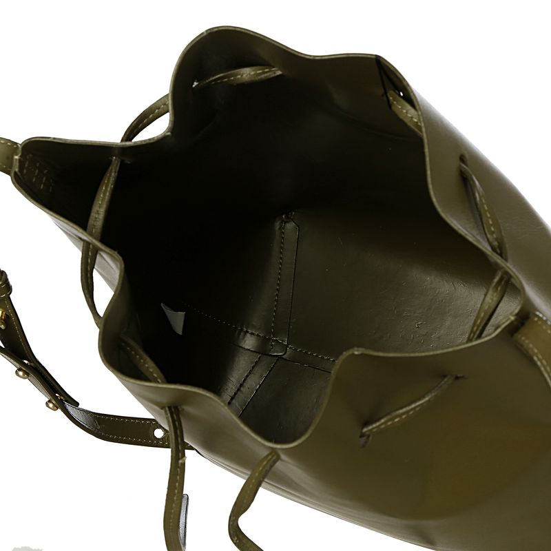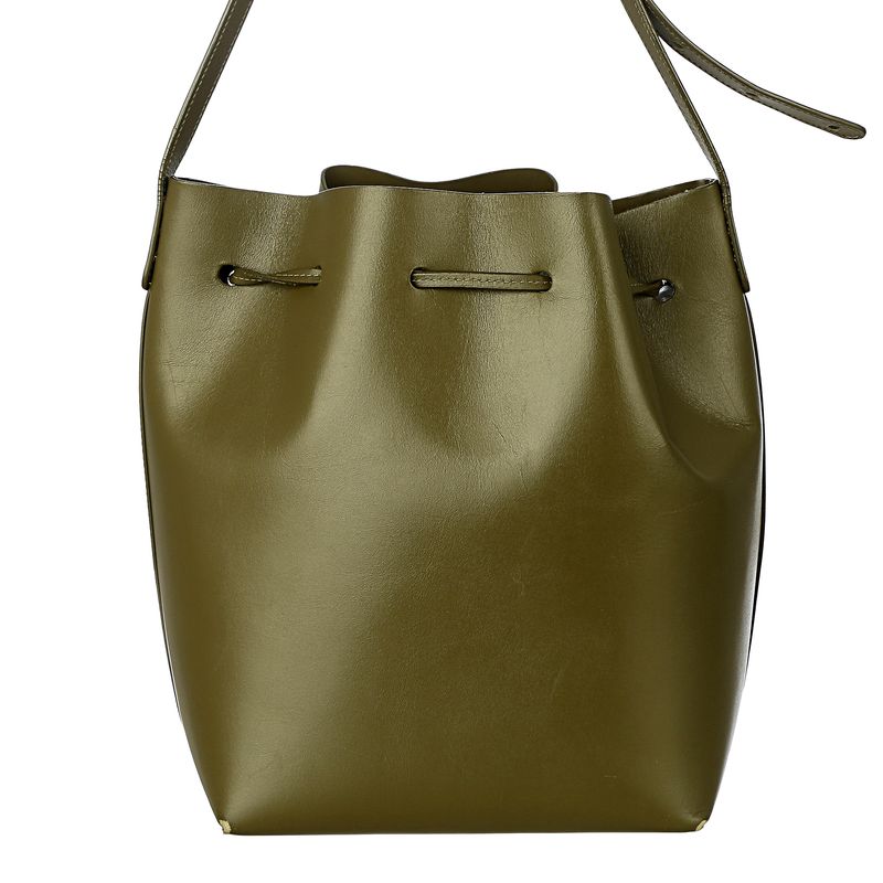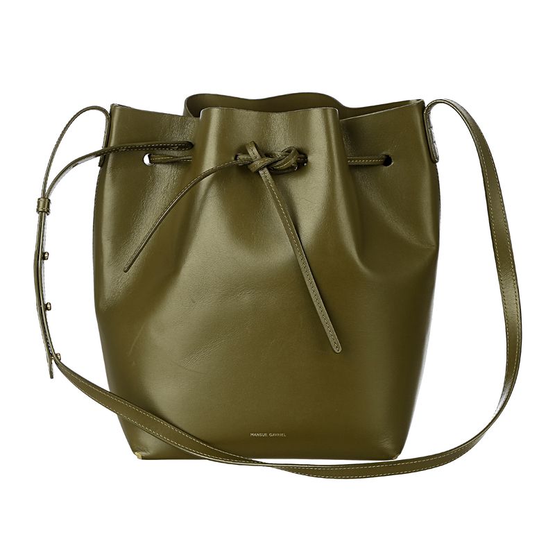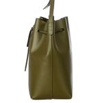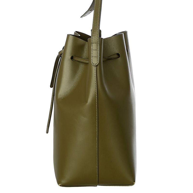 Bolsa da marca Mansur Gavriel. Confeccionada em couro na cor verde militar, conta com uma alça longa de couro e fecho por meio de amarração. A peça se encontra em ótimo estado, com leves marcas de uso nos cantos inferiores. .