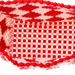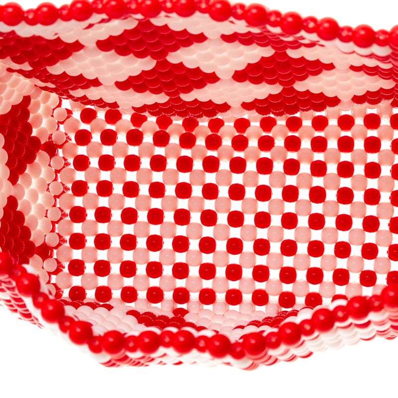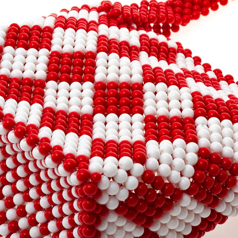 Bolsa sem fecho, toda trabalhada em miçangas de padronagem vermelha e branca. Possui alças de mão que a faz caber confortavelmente nos ombros, e pingente independente da etiqueta antiga. A peça se encontra em excelente estado, muito bem conservada.
