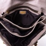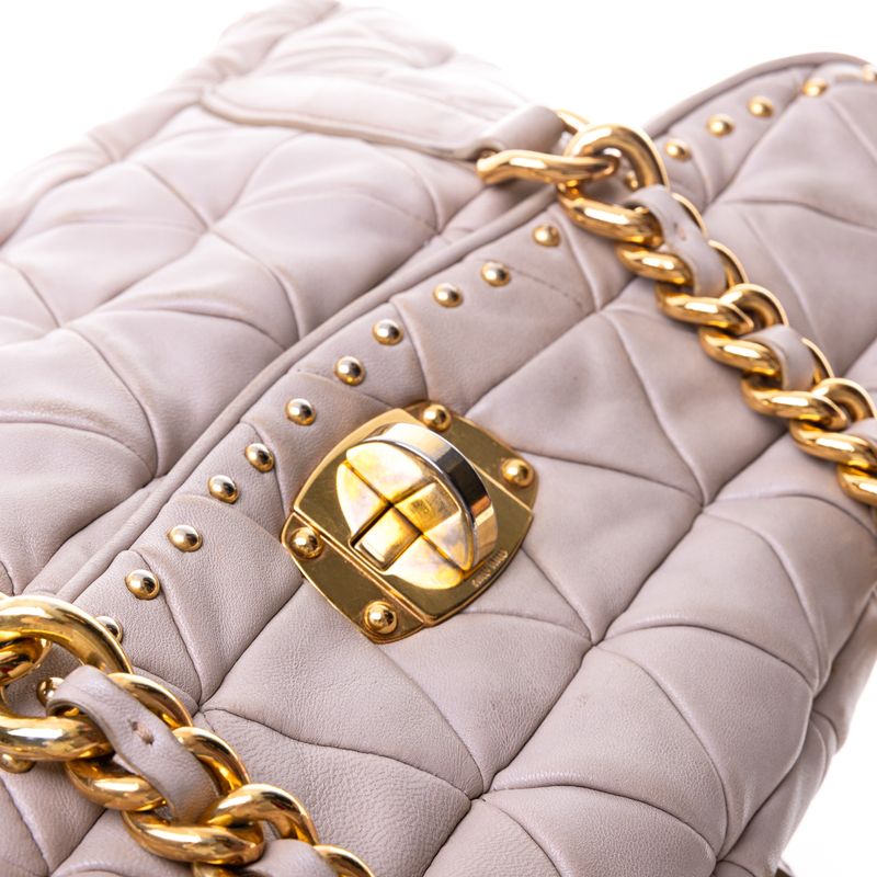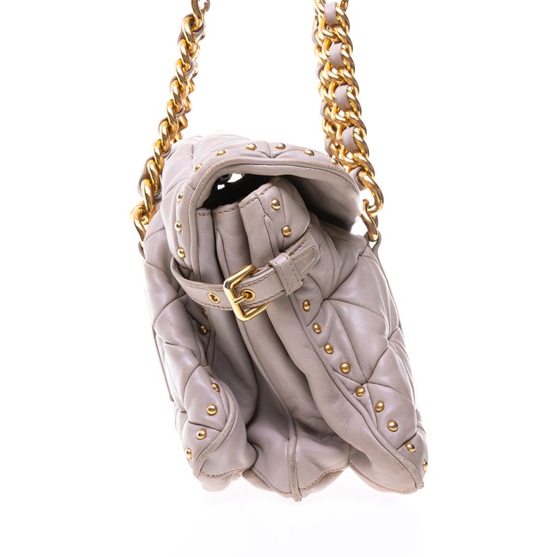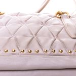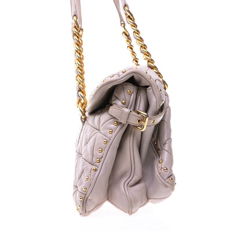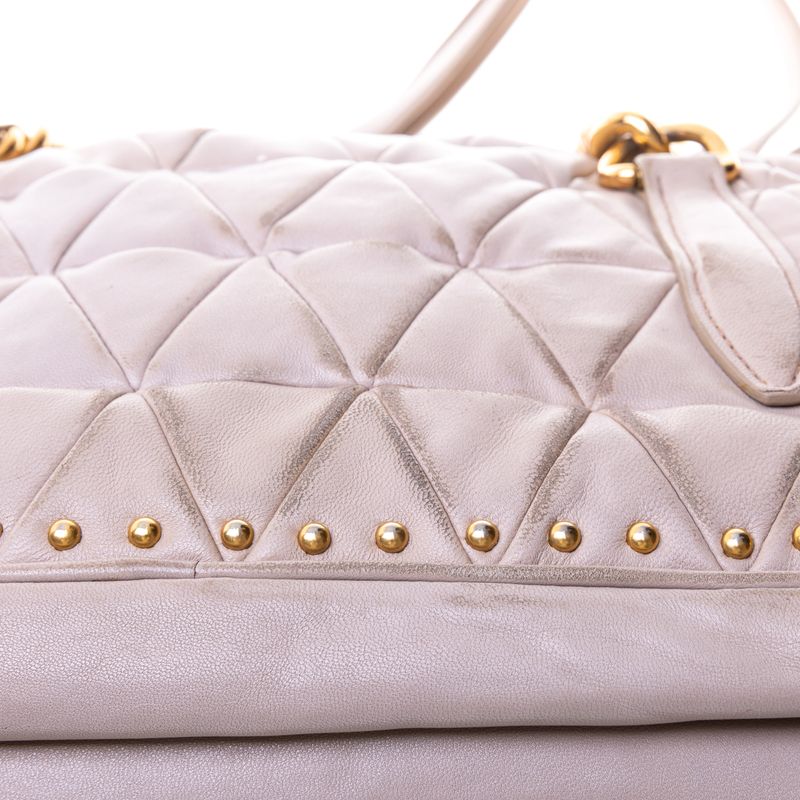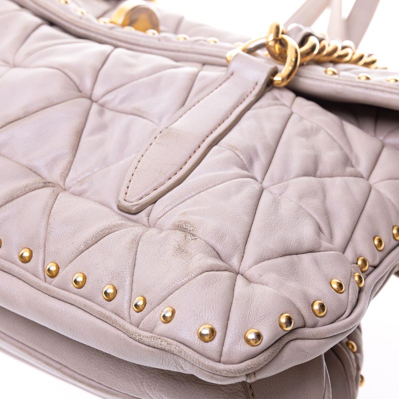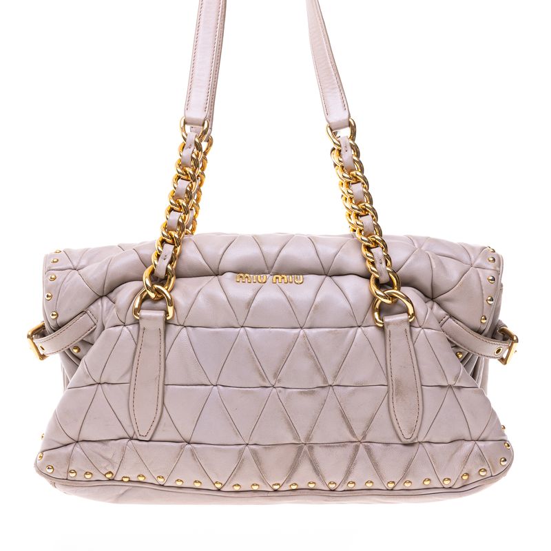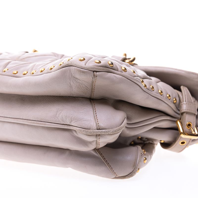 Bolsa da marca Miu Miu. Confeccionado em couro cinza claro, ferragens douradas, com aplicações de rebites ao redor da peça. A bolsa contém duas alças de ombro em correte e couro, três compartimentos, um bolso interno e fecho por dispositivo giratorio. A peça se encontra em estado satisfatório, com marcas de uso aparentes nas extremidades, desgastes nas ferragens. Medidas: 37 cm comprimento x 24 cm altura 14 cm profundidade.