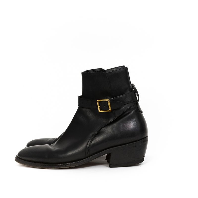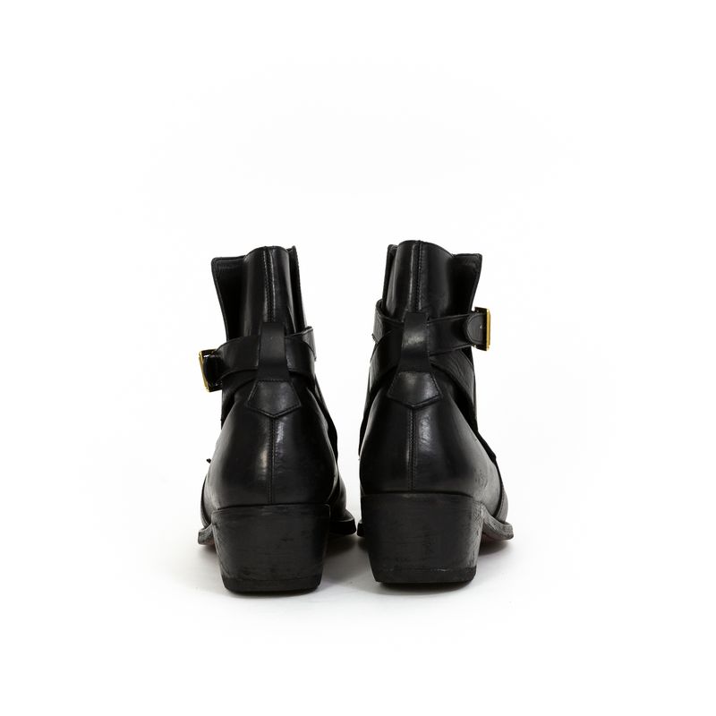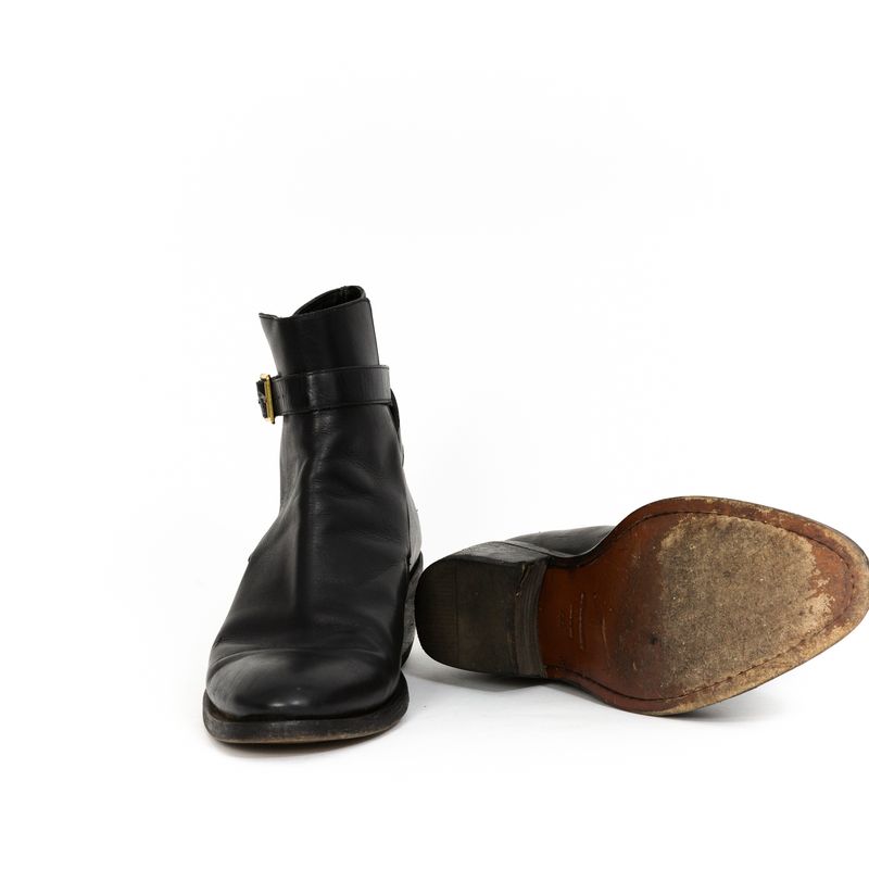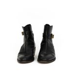 Bota da marca Burberry, tamanho 44 sola, aproximadamente 42 BR, confeccionado em couro preto. A bota tem salto de 5,5 cm e fecho por meio de fivela na lateral. Encontra-se em ótima estado de conservação, com leves desgastes.