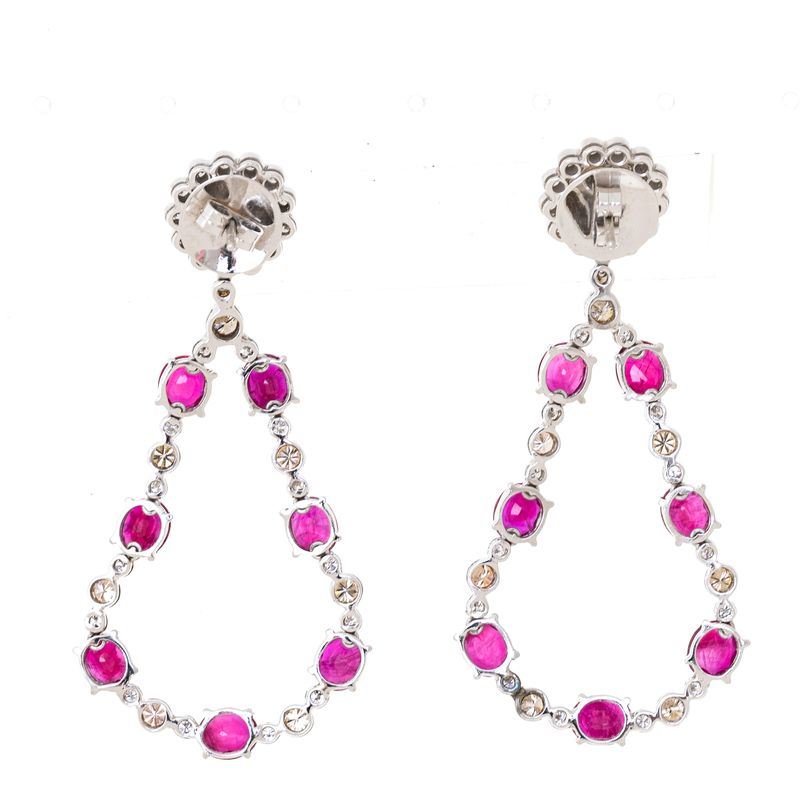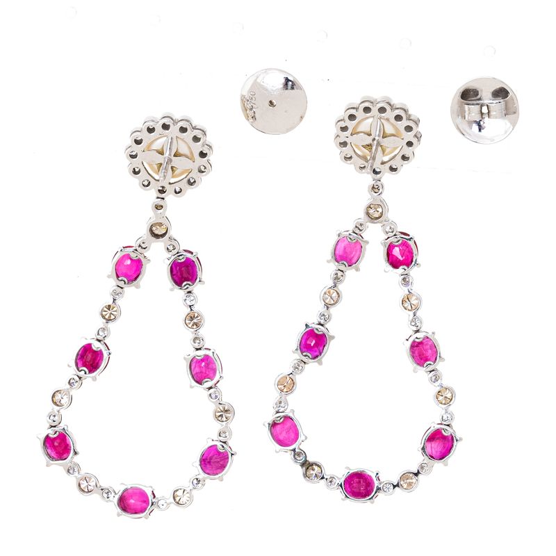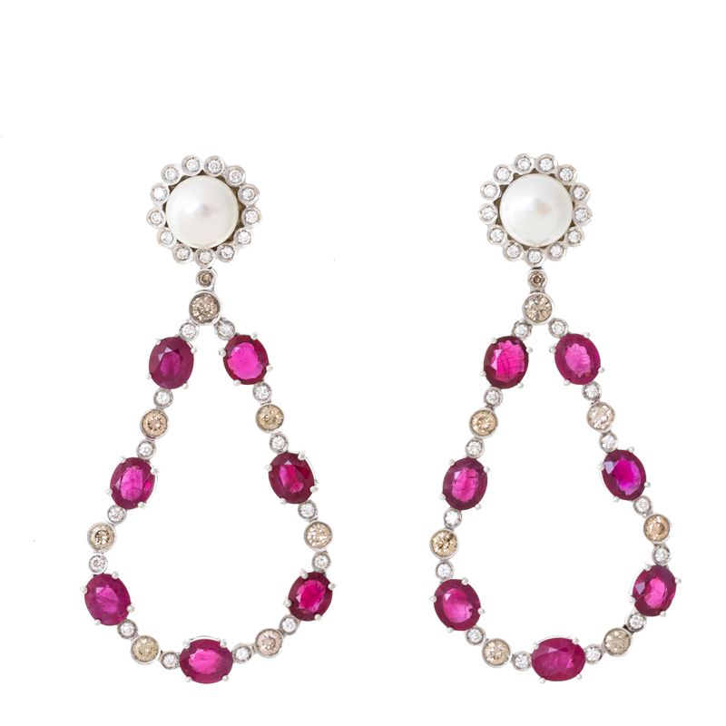 Brinco confeccionado pelo joalheiro Nathan Gilbert. Confeccionado em ouro branco pesando 17,01grs. Contendo 28 brilhantes brancos que pesam 0,43ct, 16 brilhantes conhaque que pesam 1,18ct, 14 rubis que pesam 10.15ct e um par de pérolas de 8mm. Comprimento: 6cm. A peça se encontra em excelente estado, muito bem conservada.