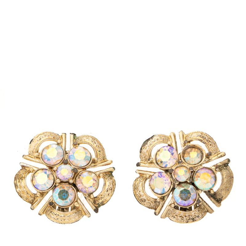 Brinco de Pressão Vintage, confeccionado em metal dourado, no formato de flor com cristais furta-cor. A peça se encontra em estado satisfatório, com marcas de uso aparentes interno.