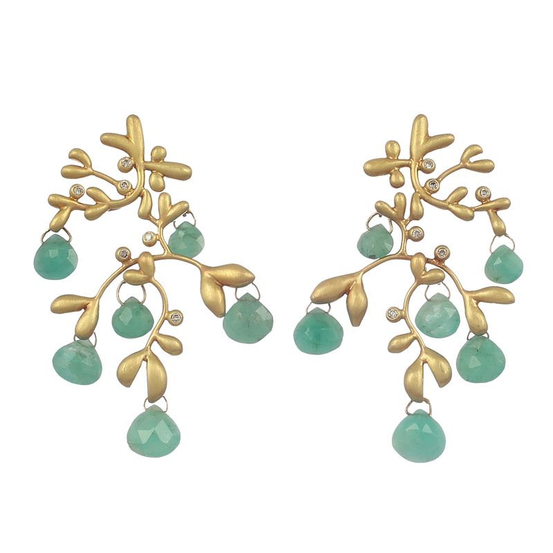 Brinco confeccionado em ouro amarelo, brilhantes e briolets verdes. Acompanha certificado. A peça se encontra em excelente estado, muito bem conservada.