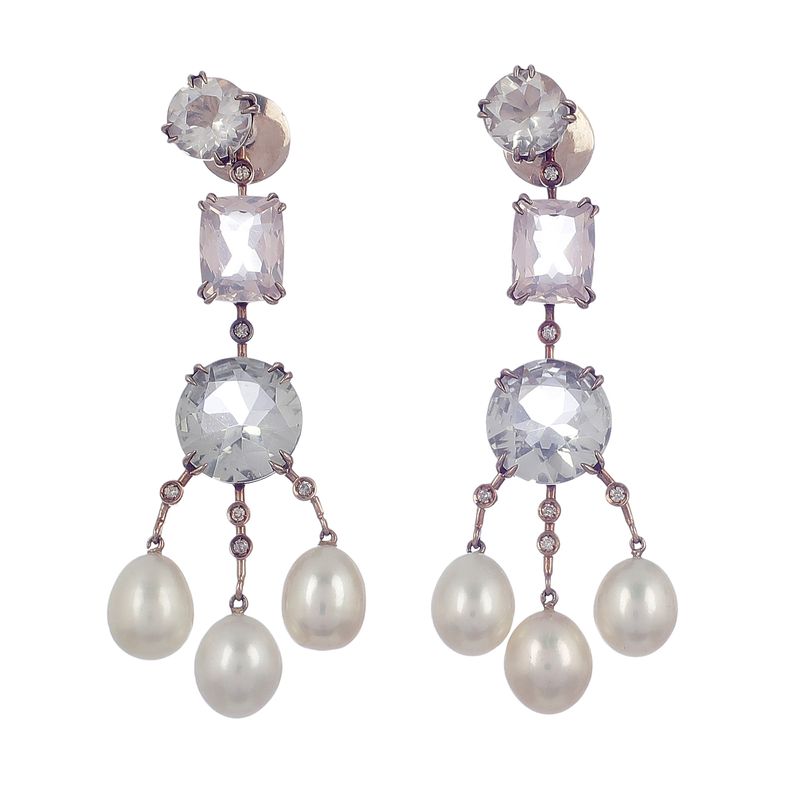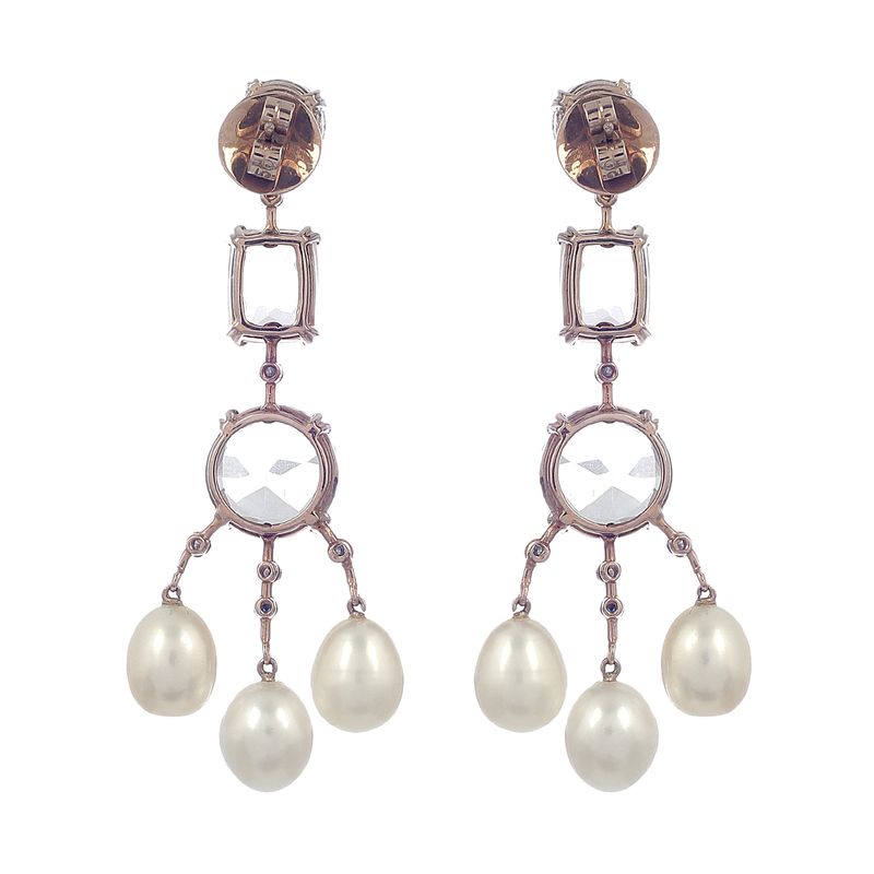Brinco confeccionado em ouro, brilhantes, cristais e pérolas. Acompanha certificado. A peça se encontra em excelente estado, muito bem conservada.