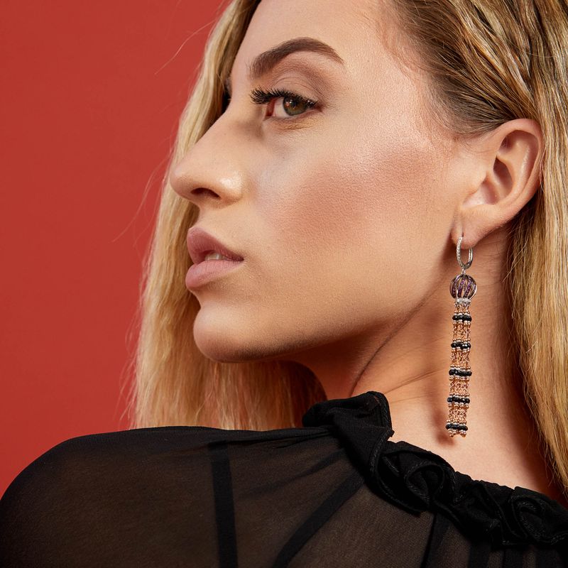 Brinco em ouro branco, cravação de diamante, bola casada cravação em rubi, cacho em ouro rose com aplicação de pérola e safira negra. Tamanho 8,3 cm de comprimento. Encontra-se em perfeito estado de conservação. Acompanha certificado.