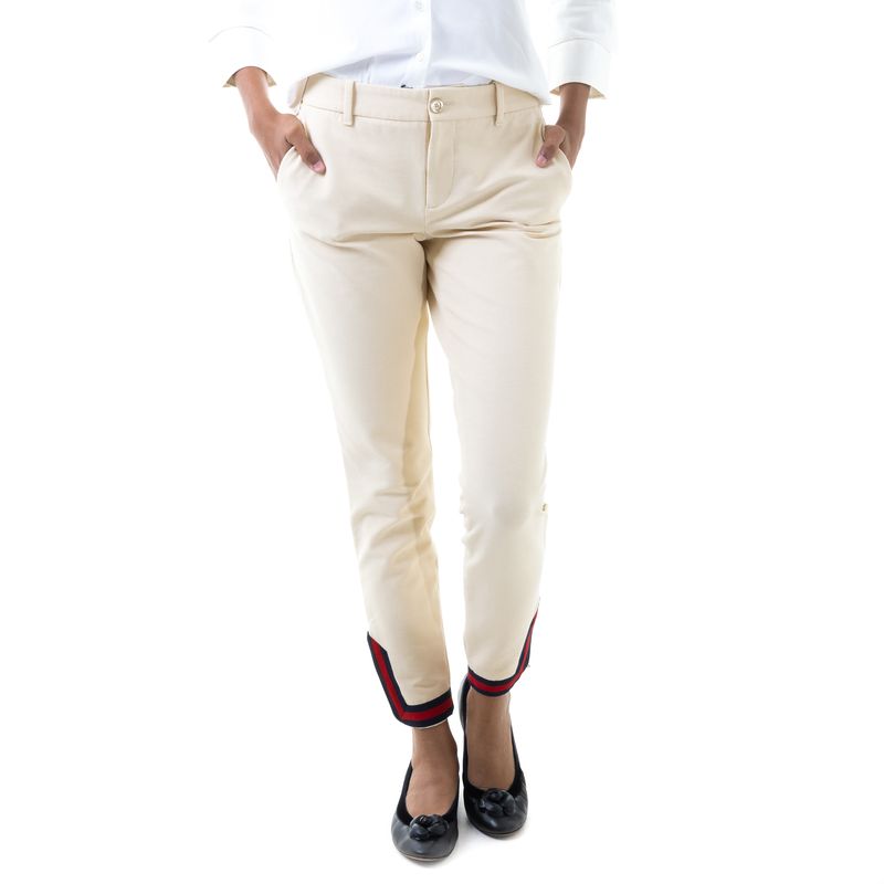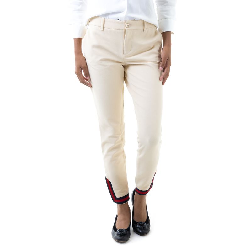 Calça da marca Gucci, tamanho 40 Itália aproximadamento 38 Brsil. Confeccionado em tecido na cor creme, faixa web azul e vermelho e zíper nas barras. Fachamento botão e zíper. A peça se encontra em ótimo estado, com levíssimas marcas de uso.