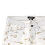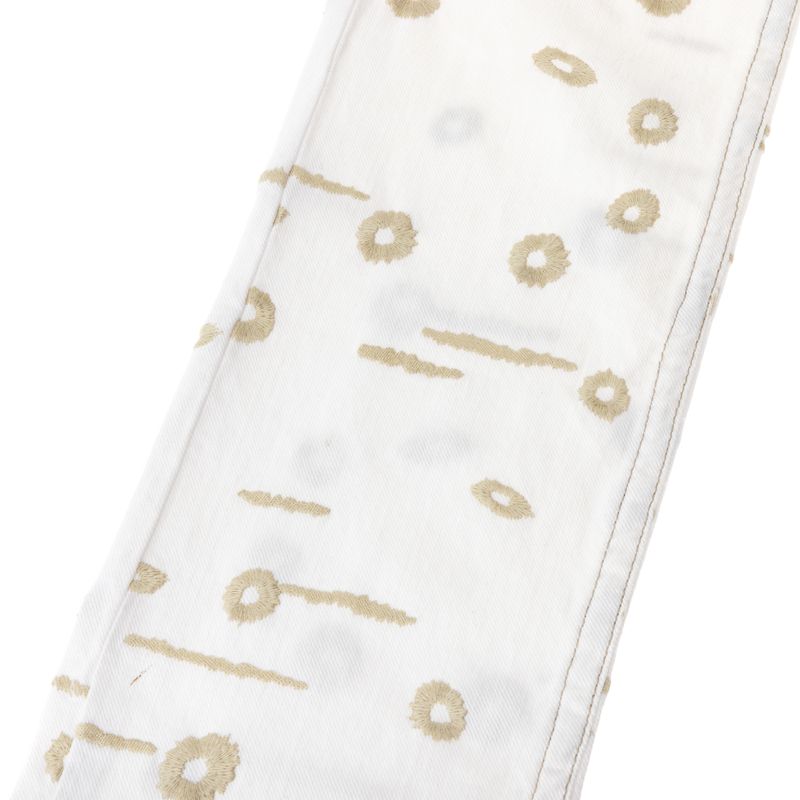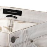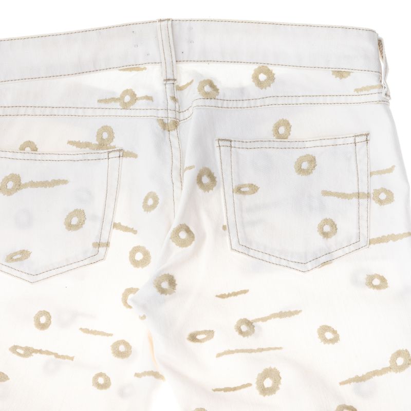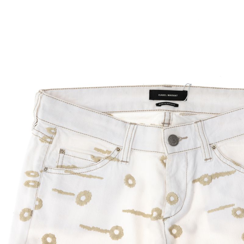 Calça Jeans da marca Isabel Marrant. Confeccionado em algodão na cor branca, bordado em toda calça, cinco bolsos e fecho por zíper e botão. A peça se encontra em ótimo estado, com leves marcas de uso.