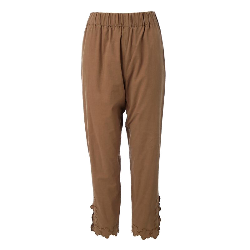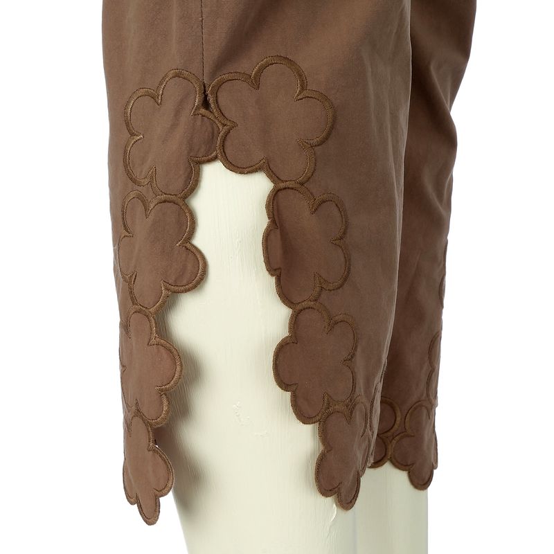 Calça da marca Paula Raia. Confeccionada em algodão marrom e bordado de flores na parte de baixo. Possui elástico na cintura. A peça se encontra em excelente estado, muito bem conservada.