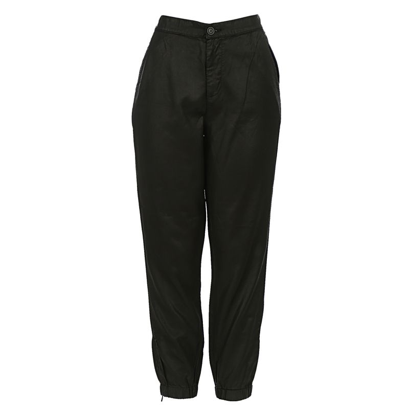 Calça Preta confeccionado em liocel acetinado, dois bolsos, elástico nas barras e zíper, tamanho M. A peça se encontra em estado satisfatório, com leves marcas de uso aparentes.