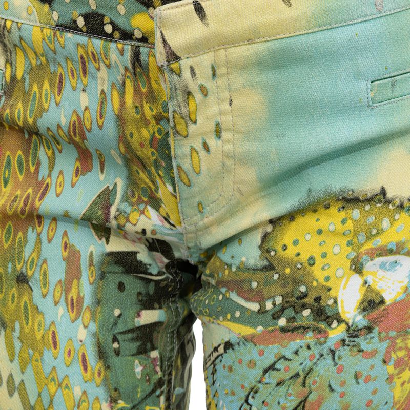 Calça da marca Roberto Cavalli. Confeccionado em sarja estampa arara, dois bolsos de couro bege e fecho por zíper. A peça se encontra em ótimo estado, com levíssimas marcas de uso.