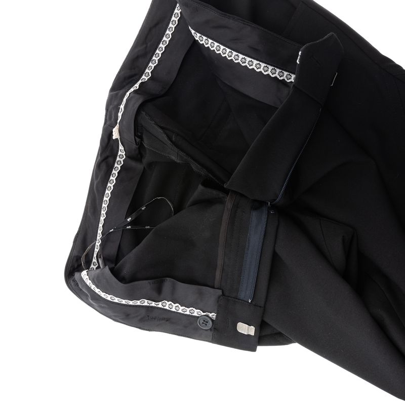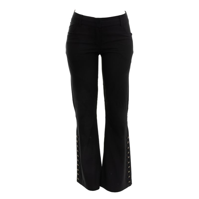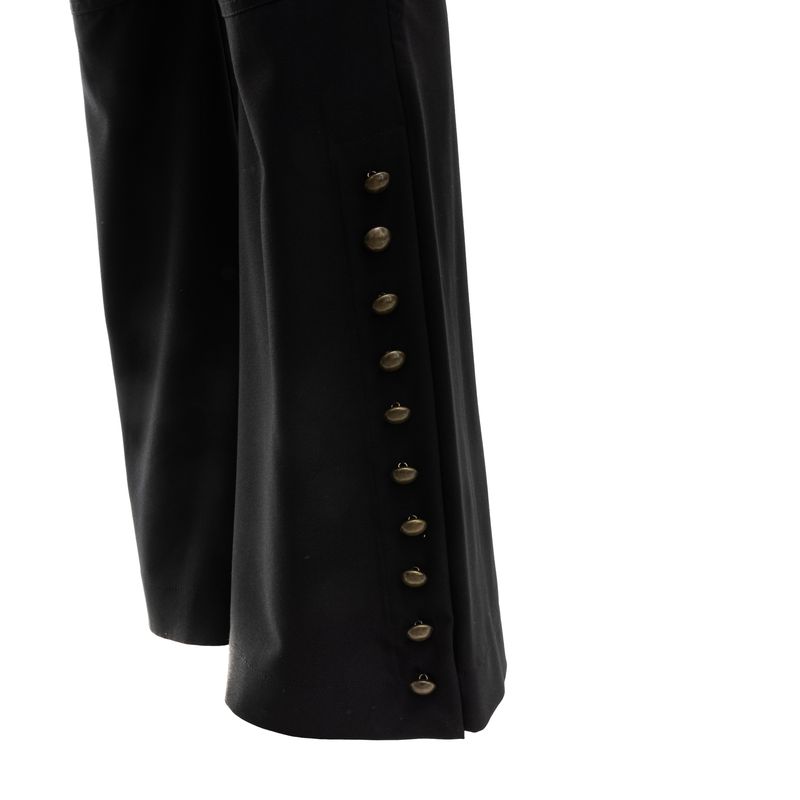 Calça da marca Talie NK Store Alfaiataria. Confeccionado em tecido preto, dois bolsos frontais, boca de sino com botões, fecho por zíper e botão. A peça se encontra em bom estado, com leves marcas de uso, sem etiqueta de composição.