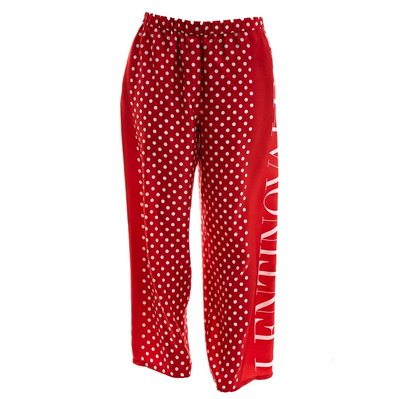 Calça da marca Valentino Garavani. Confeccionada em Seda na estampa poá com cores vermelho e branco, e "Valentino" escrito na lateral na perna esquerda. A calça possui bolsos e elástico na cintura. A peça se encontra em excelente estado, muito bem conservada.