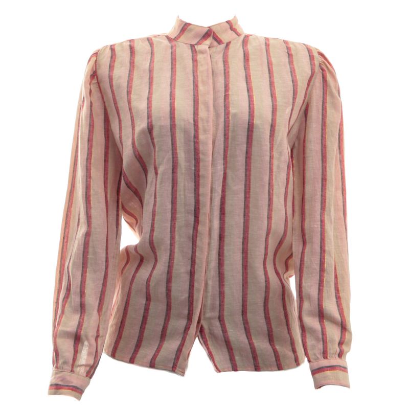 Camisa Mixed. Confeccionada em linho rosa com fios de lurex, possui gola de padre, mangas longas com botões nos punhos e fecho frontal por botões invisíveis. A peça se encontra em muito bom estado geral, com leves fios soltos e puidos.