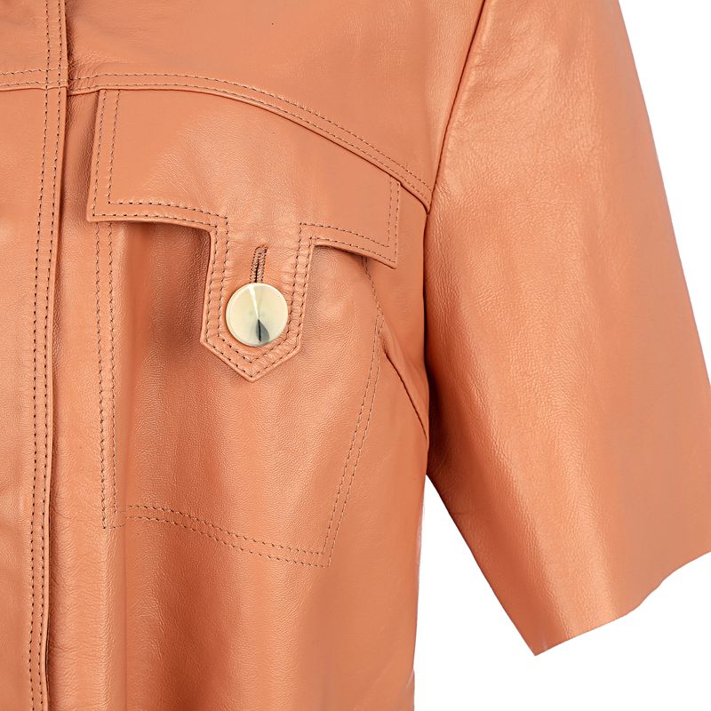 Camisa da marca NK. Confeccionada em couro laranja, com fecho por meio de botões de pressão na parte da frente e dois botões bege. A peça se encontra em excelente estado, muito bem conservada.