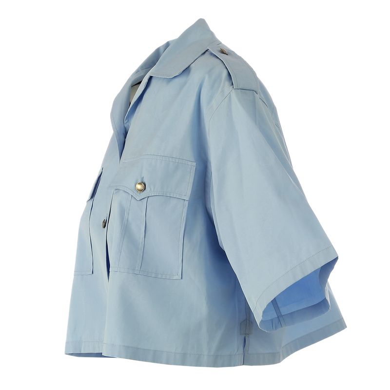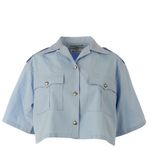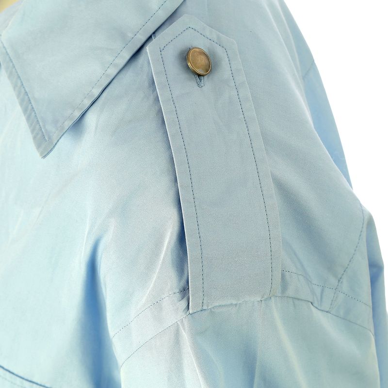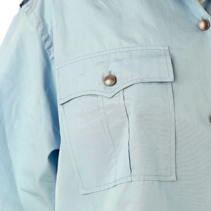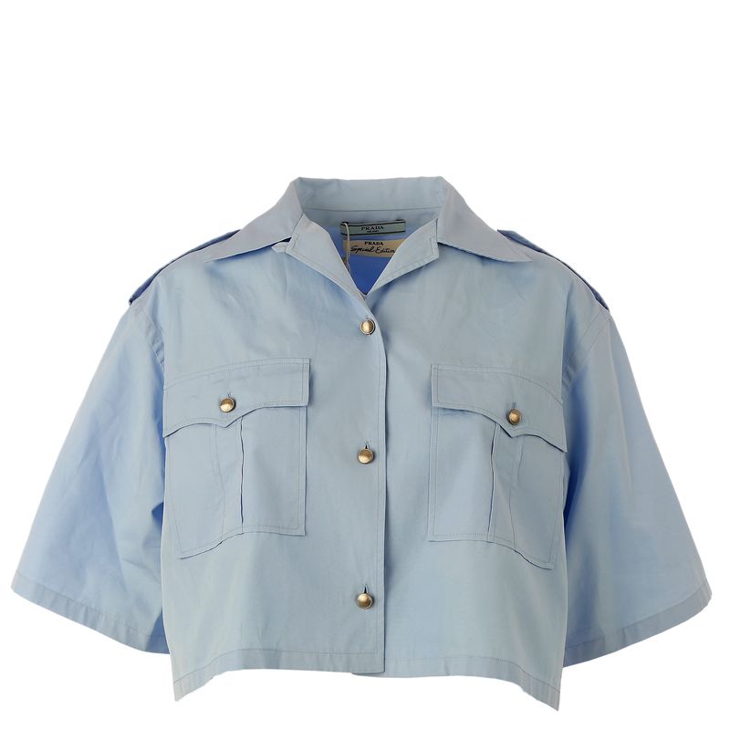 Camisa da marca Prada. Confeccionada em algodão azul, possui dois bolsos na parte da frente e fecho por meio de botões. A peça contém marcas de uso expressivas, manchas e/ou danos. Contém duas manchinhas mais claras na parte da frente do lado esquerdo.