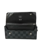 Carteira da marca Louis Vuitton, tamanho 20 cm L x 10 cm A, confeccionada em canvas damier grafite com ferragens em metal prateado. Conta com três compartimentos internos. Encontra-se em ótimo estado de conservação, com iniciais G.S gravada na parte interna.