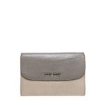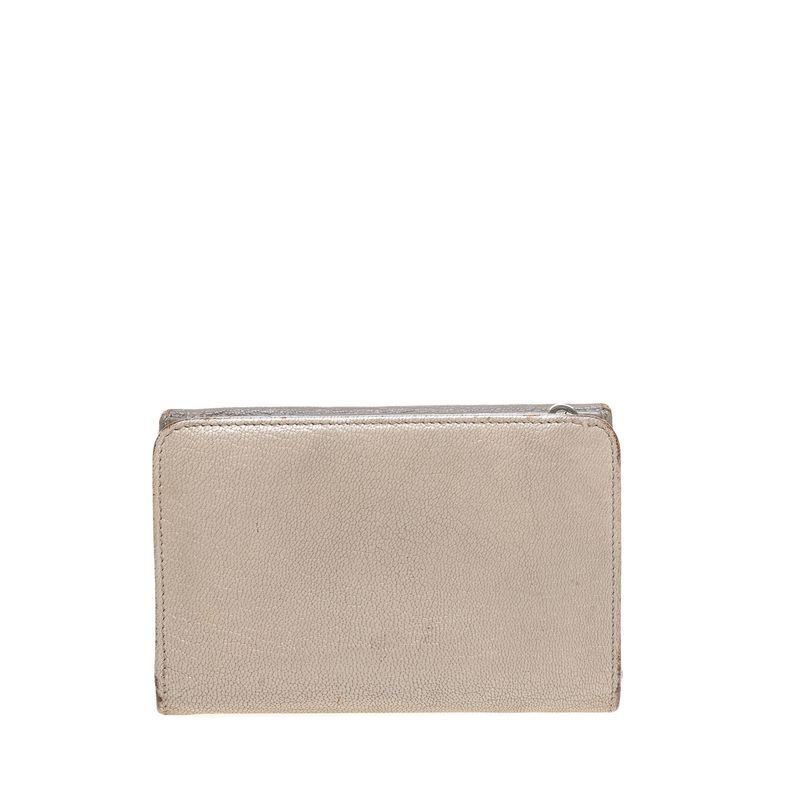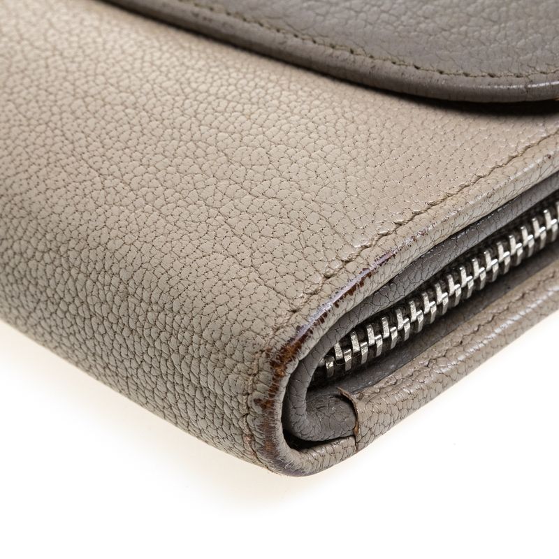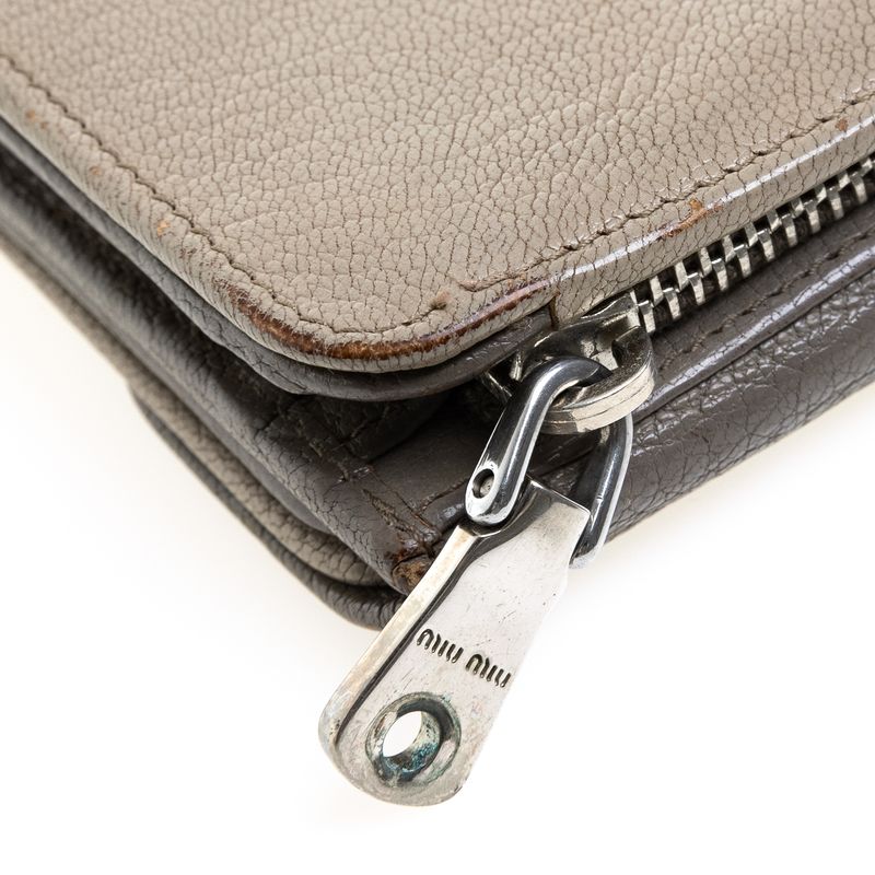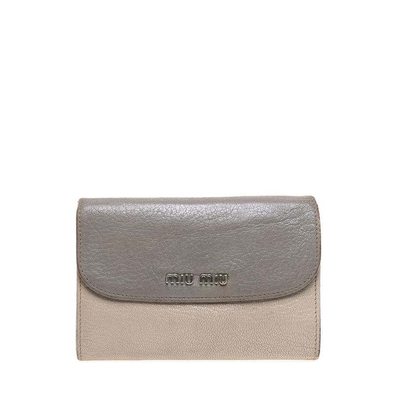 Carteira da marca Miu Miu. Confeccionada em couro na cor cinza. Possui 1 compartimento com fecho de zíper e outro com fecho de flap com botão. A peça contém marcas de uso expressivas, variações no tom de cinza ao longo da peça, e intenso odor de guardado. Medidas: 14cm comprimento x 9cm altura x 2cm profundidade.