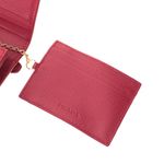 Carteira da marca Prada. Confeccionado em couro saffiano vermelho, fechamento por botão de pressão, porta moedas com fechamento por zíper, compartimentos internos para cartões, bolso com zíper na parte posterior e tag removível. A peça se encontra em excelente estado, muito bem conservada.