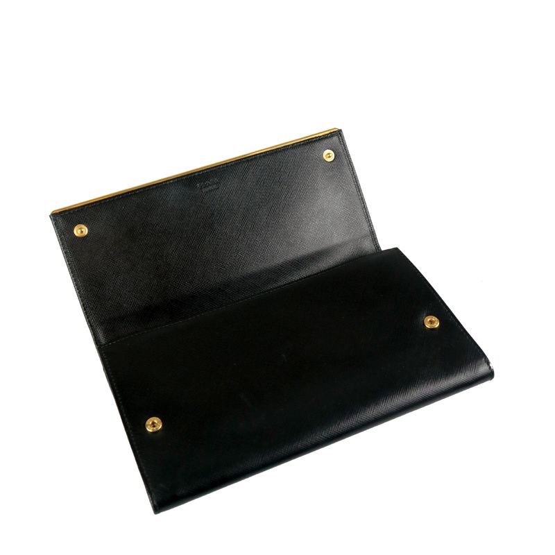 Carteira da marca Prada, tamanho 21 cm C x 12 cm A, confeccionado em couro saffiano preto. A carteira conta com três compartimentos internos e fecho por meio de botão. Encontra-se em excelente estado de conservação.