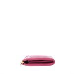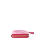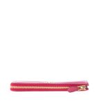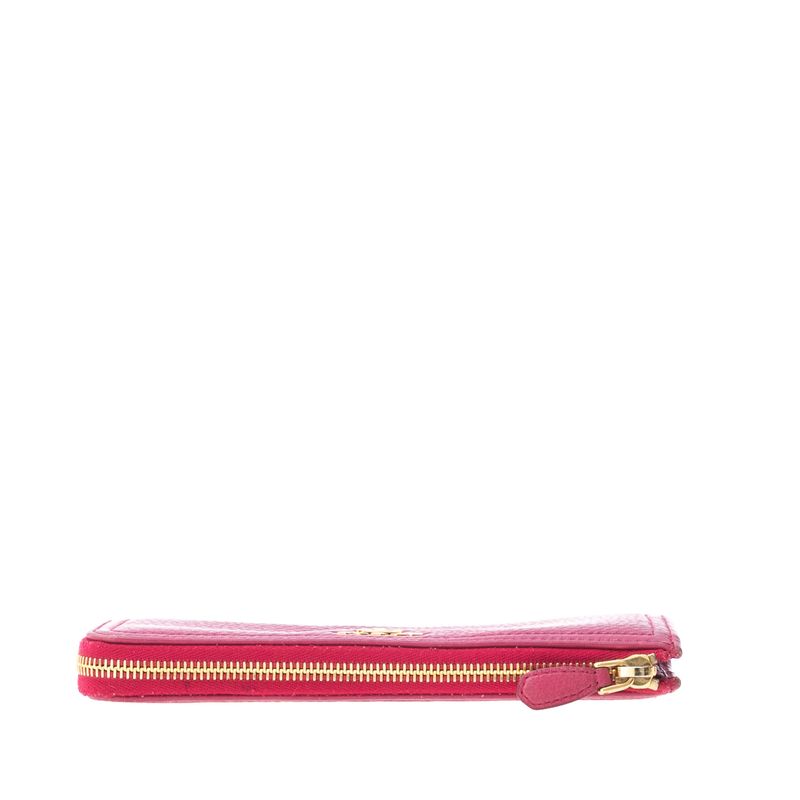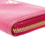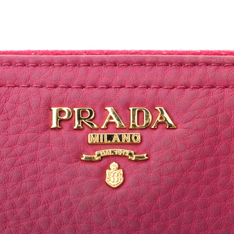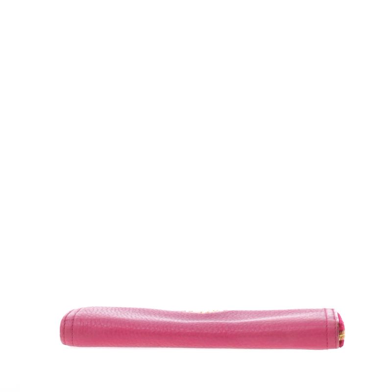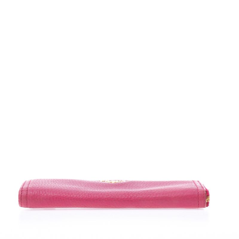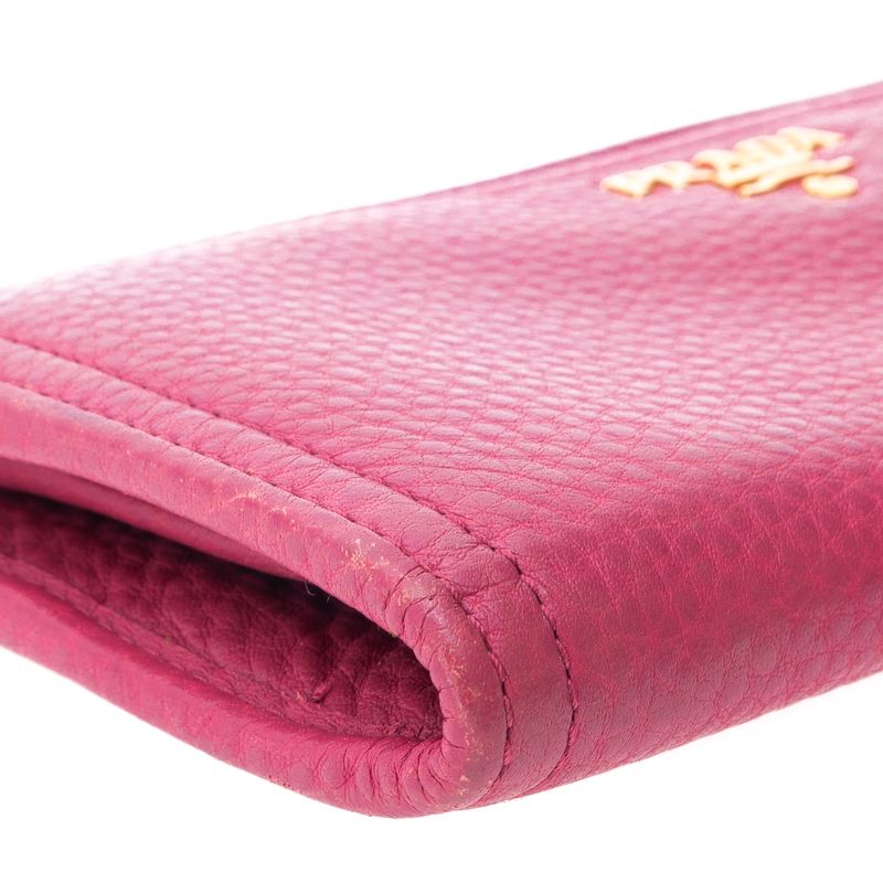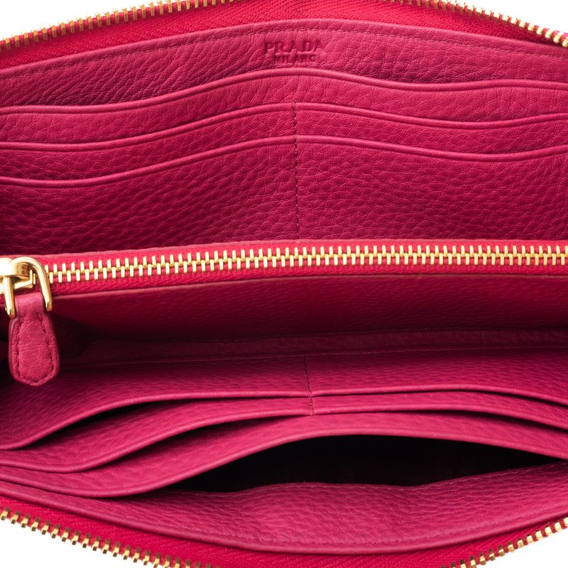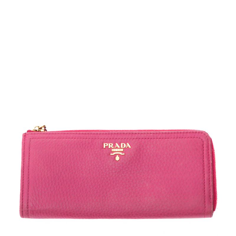 Carteira Prada, modelo de Vitello Daino. Confeccionada em couro rosa, com ferragens douradas, fecho por zíper, cinco compartimentos e oito espaços para cartões. A peça se encontra em bom estado, com leves manchinhas no couro e desgaste nas bordas.