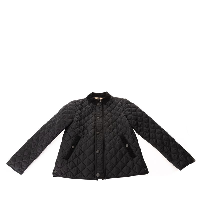 Casaco Infantil da marca Burberry, tamanho 10y/140cm. Confeccionado em nylon na cor preta matelassê, gola em tecido, fechamento por botão e zíper, mangas longas e dois bolsos. A peça se encontra em bom estado, com leves marcas de uso.