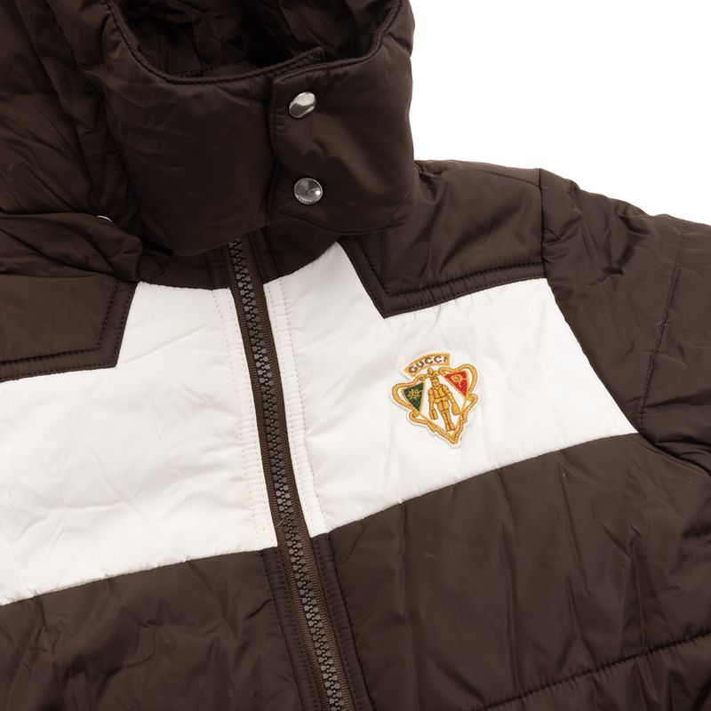 Casaco Infantil da marca Gucci, tamanho 4. Confeccionado em nylon na cor marrom, detalhes com tecido nylon branco frontal. Acompanha dois bolsinhos, capuz e fecho por zíper. A peça se encontra em excelente estado, muito bem conservada.