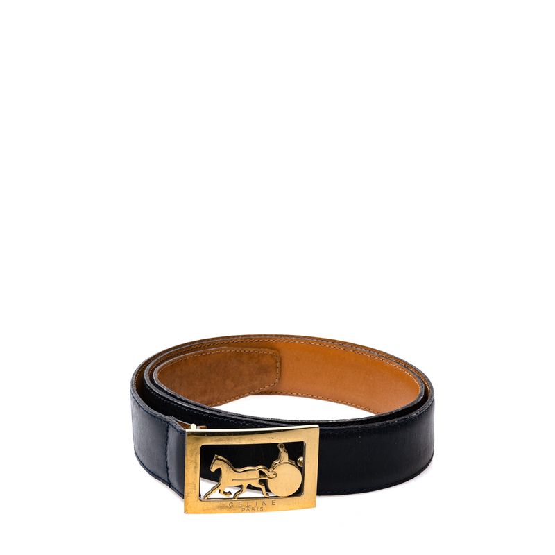 Cinto da marca Celine Vintage. Confeccionado em couro azul marinho, fivela de metal dourado quadrada com desenho de carroça. Possui tamanho 98/1 (95,5 cm). A peça contém marcas de uso expressivas nos furos de ajuste com desgastes e marcas de dobra, riscos nos metais, desgastes no couro.